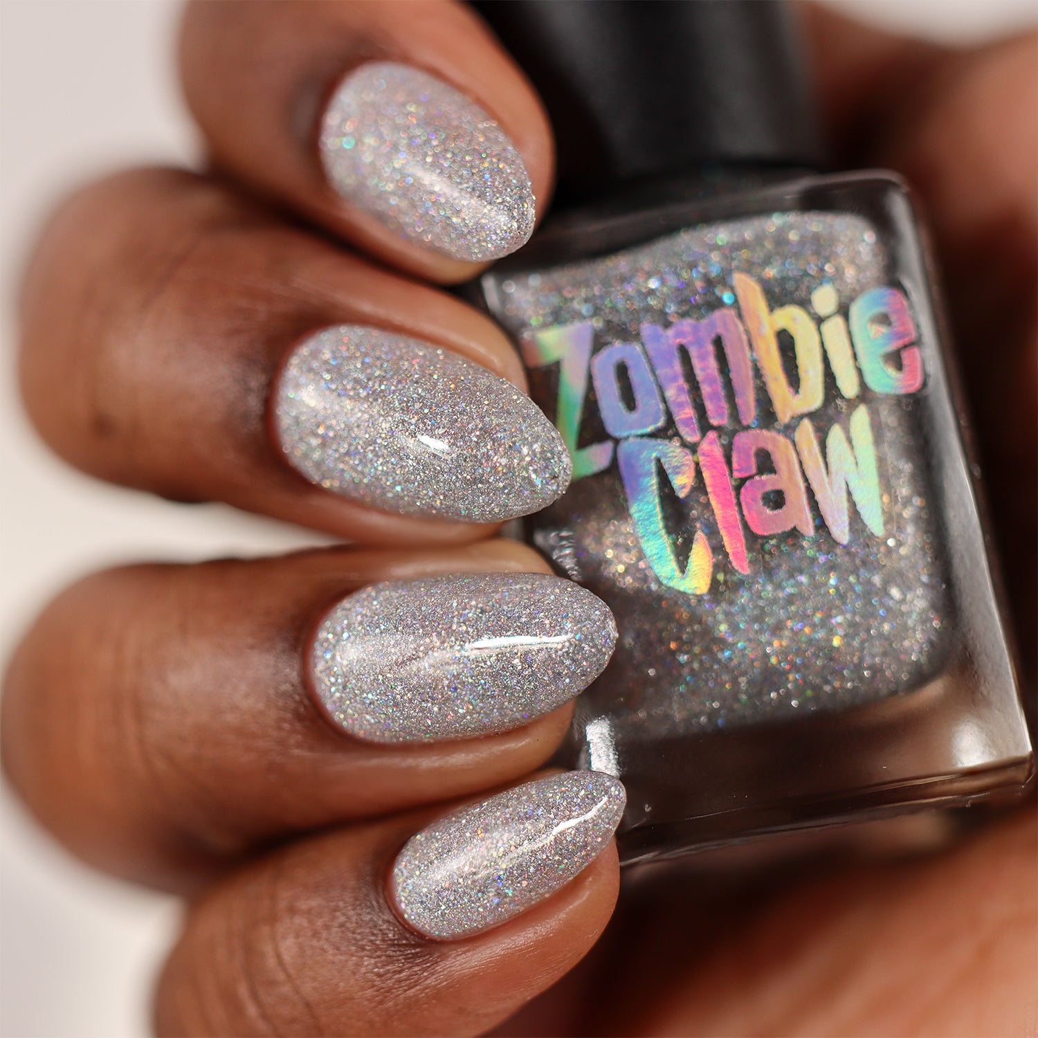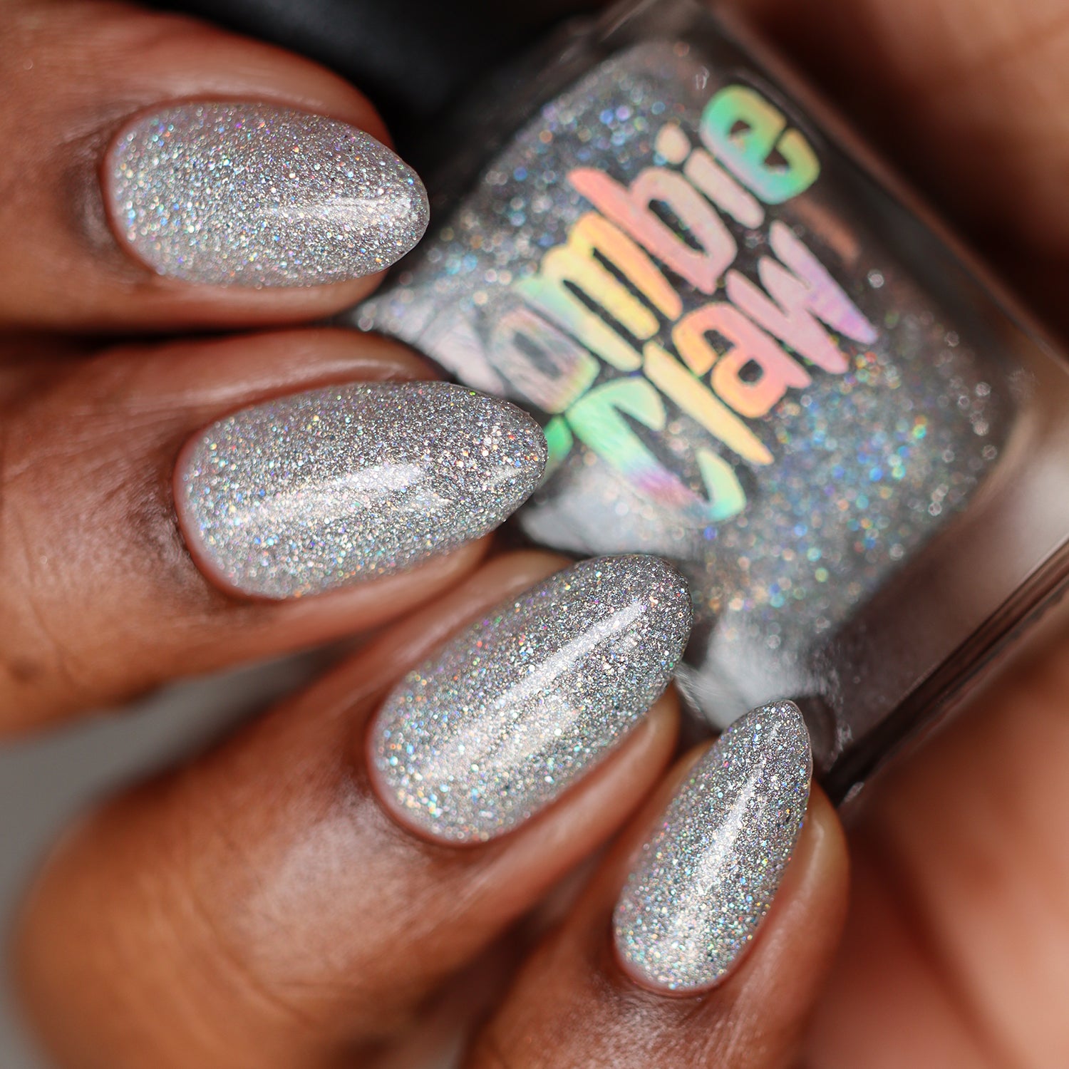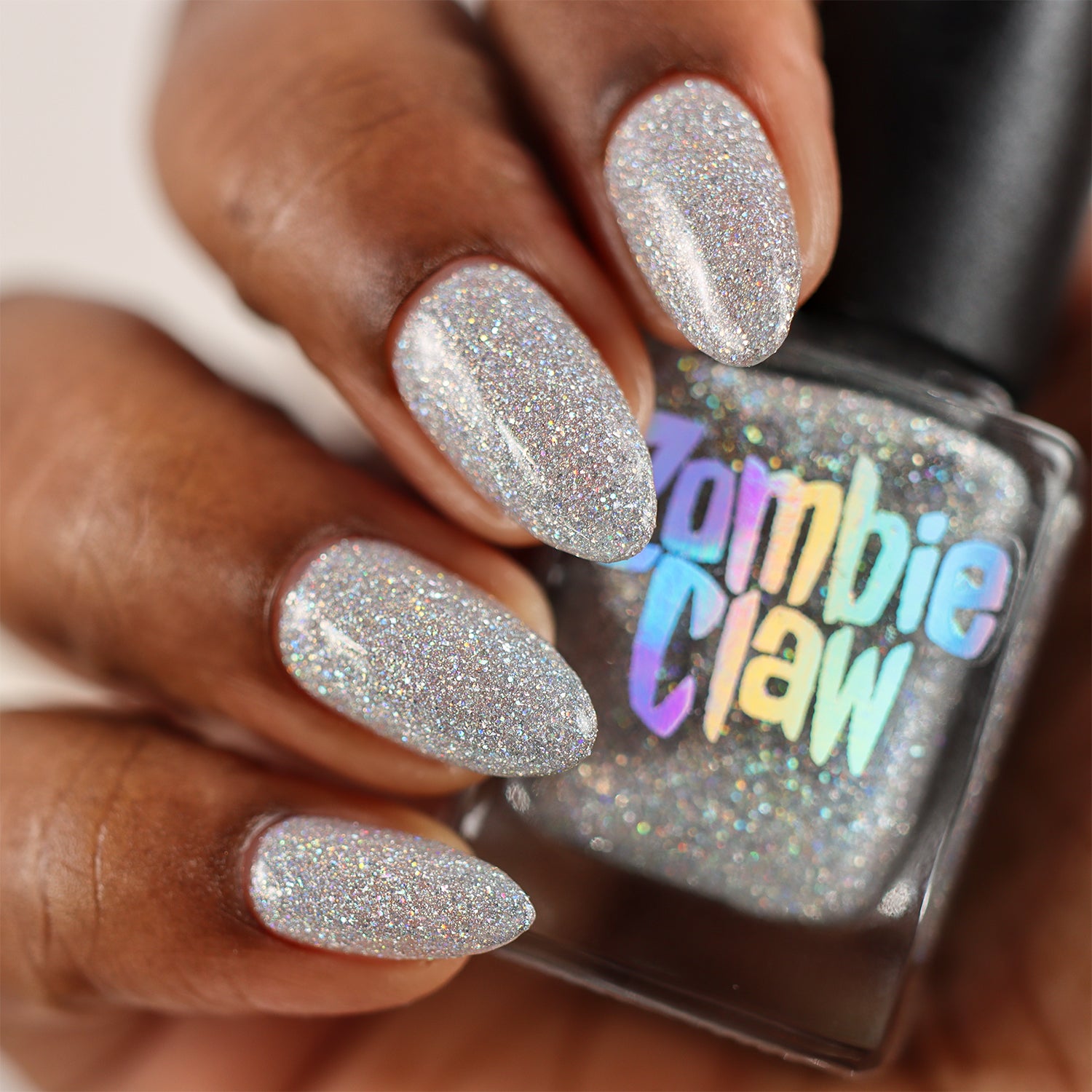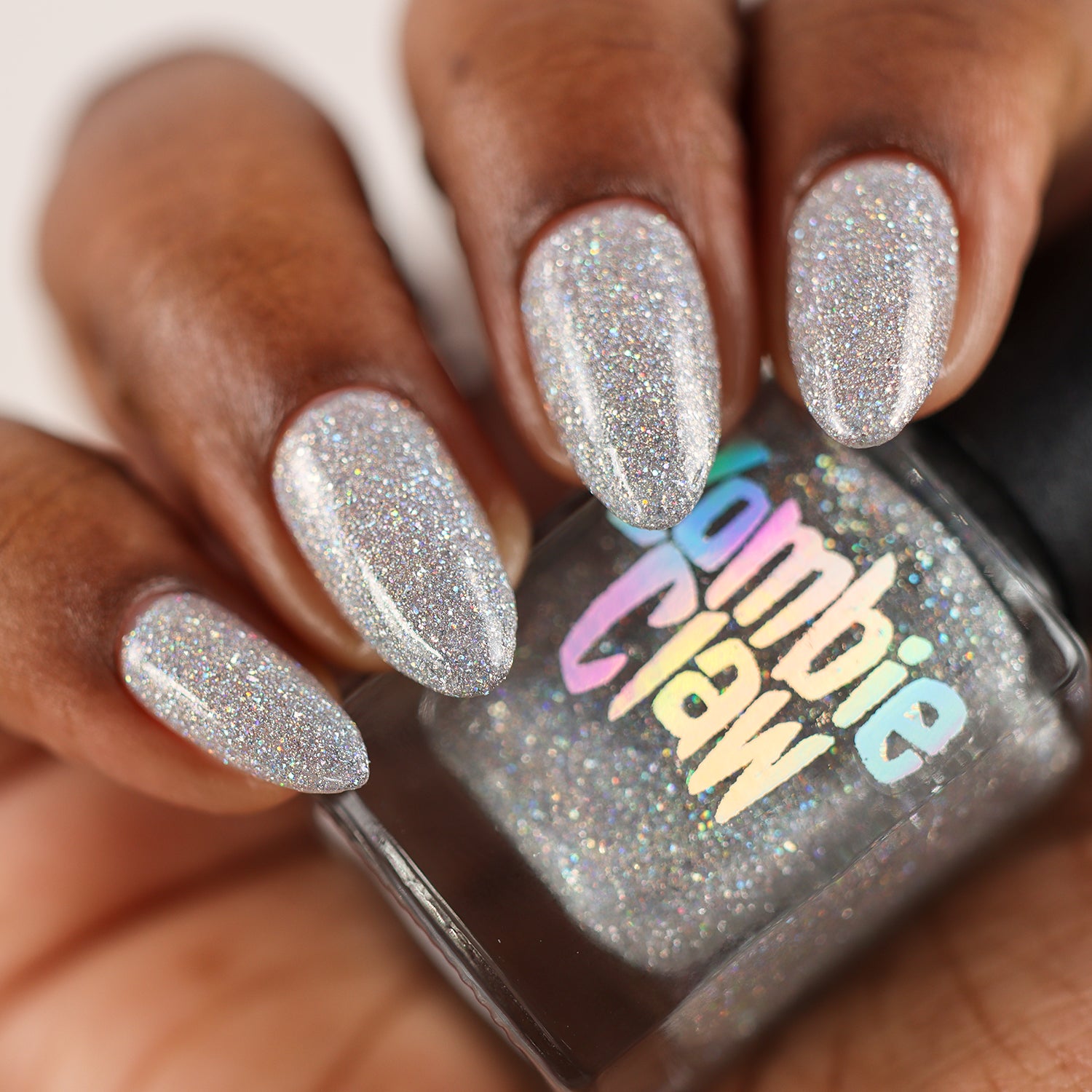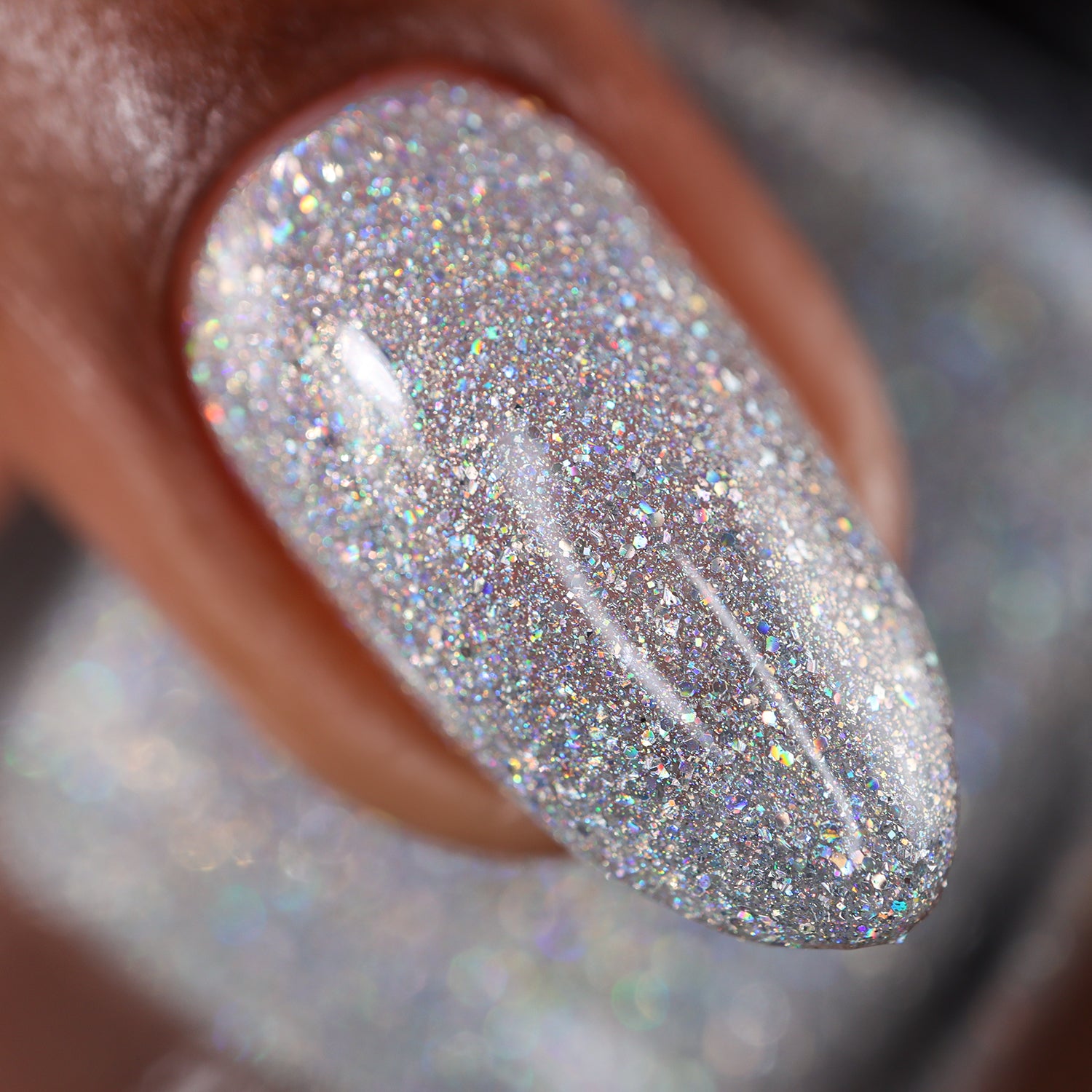 A sheer white base with linear holo, holo flakes and silver holo glitters.