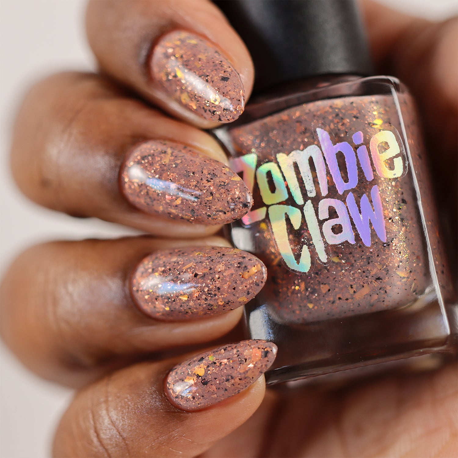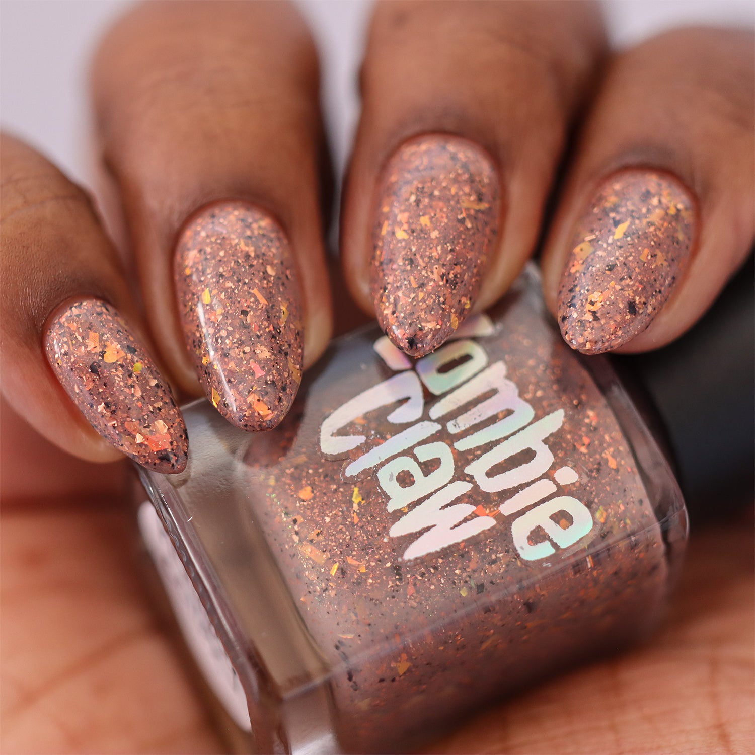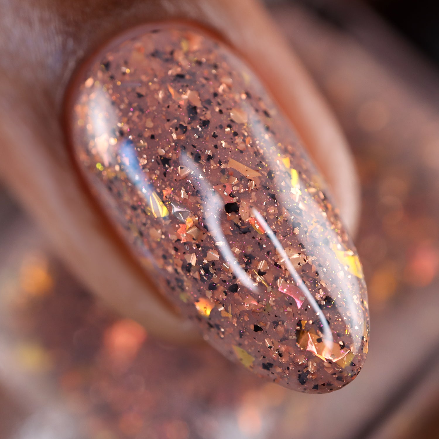 A mocha base with bronze/red/orange/yellow/peach/black flakies and electric gold/red shimmer.
