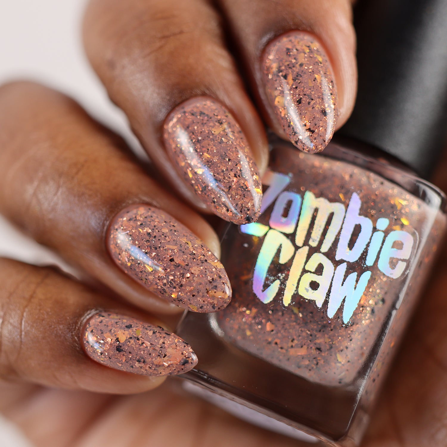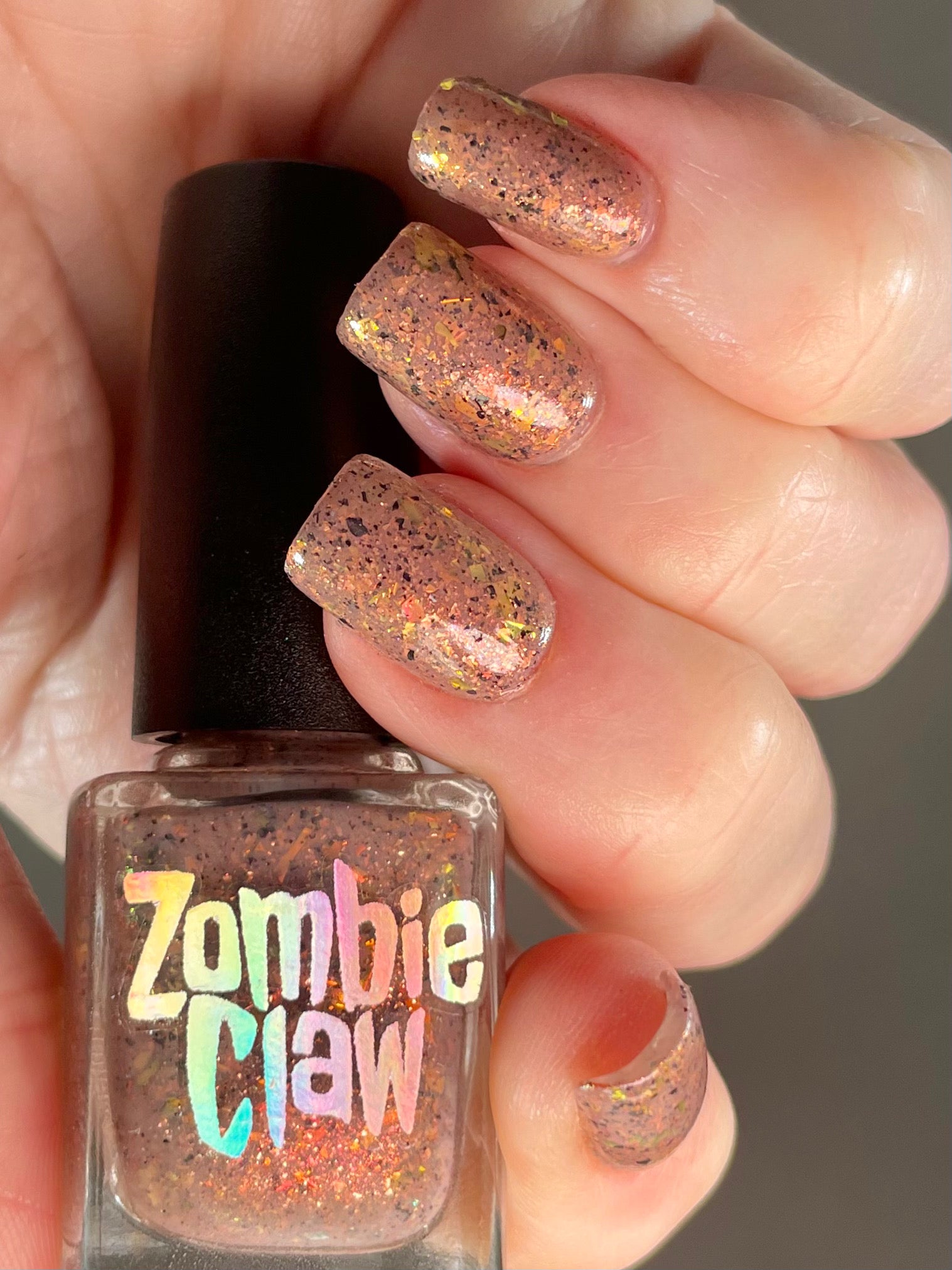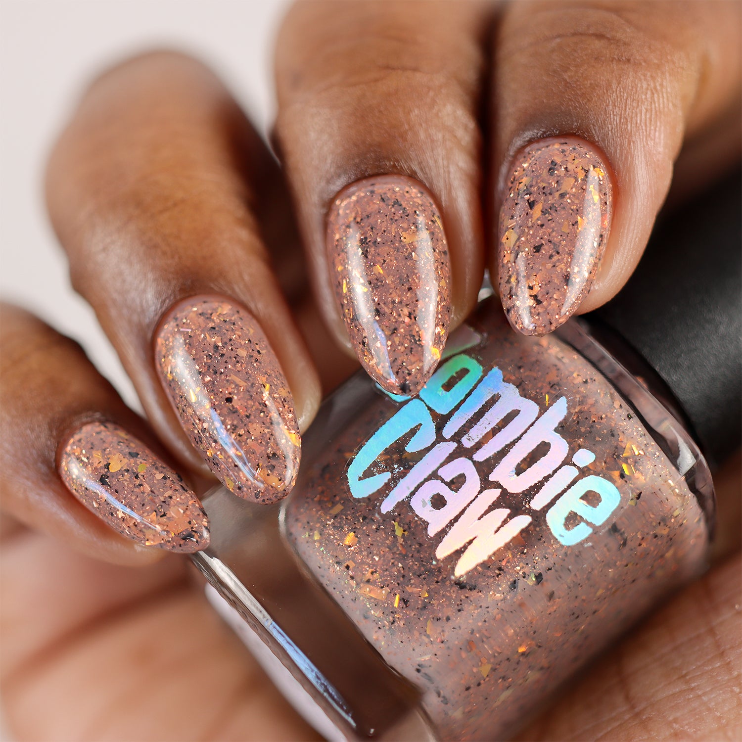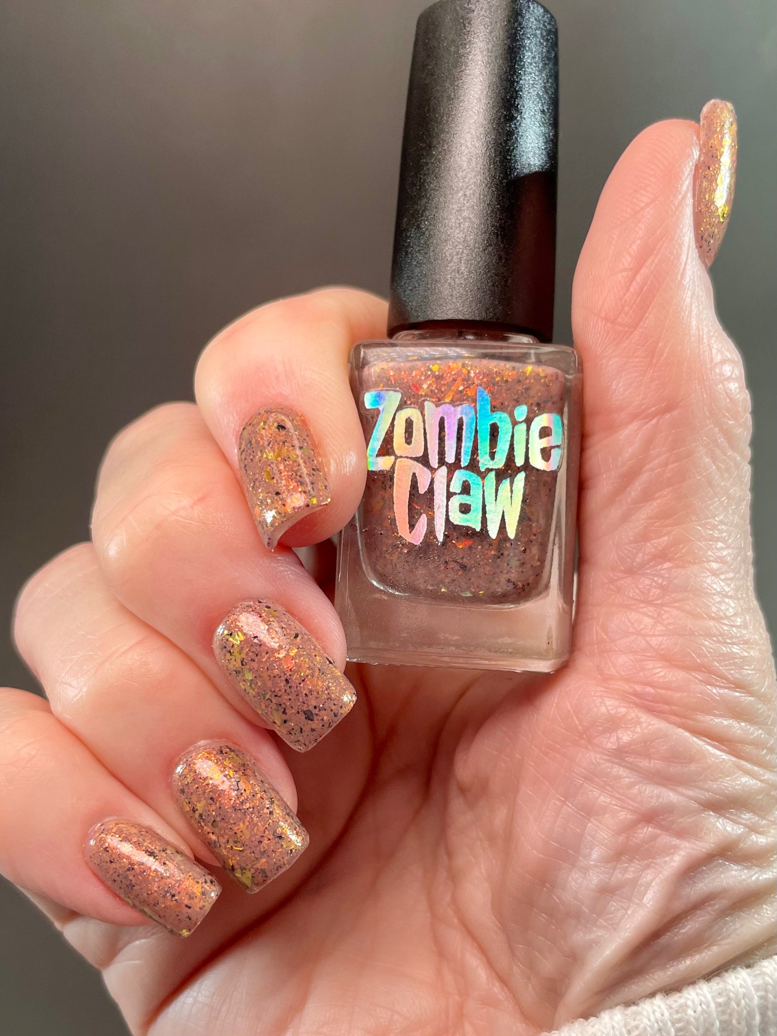 A mocha base with bronze/red/orange/yellow/peach/black flakies and electric gold/red shimmer.
