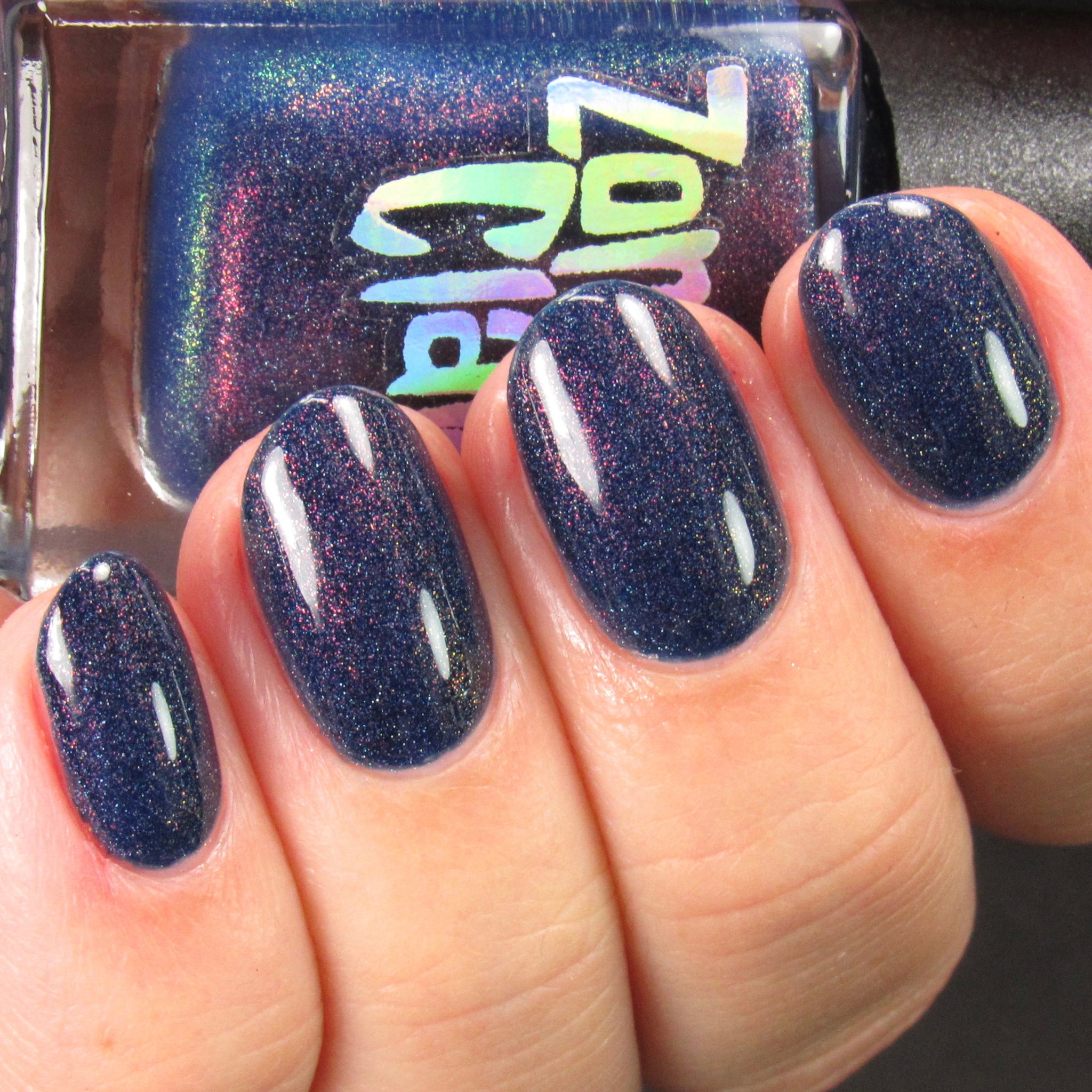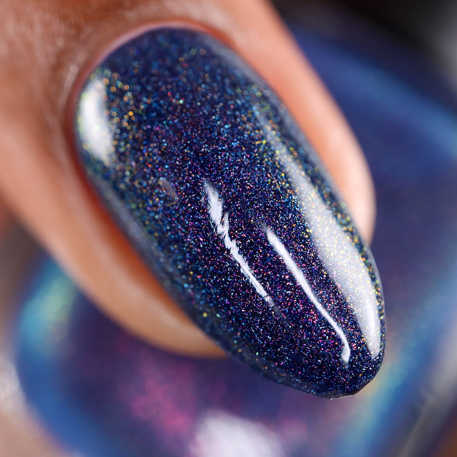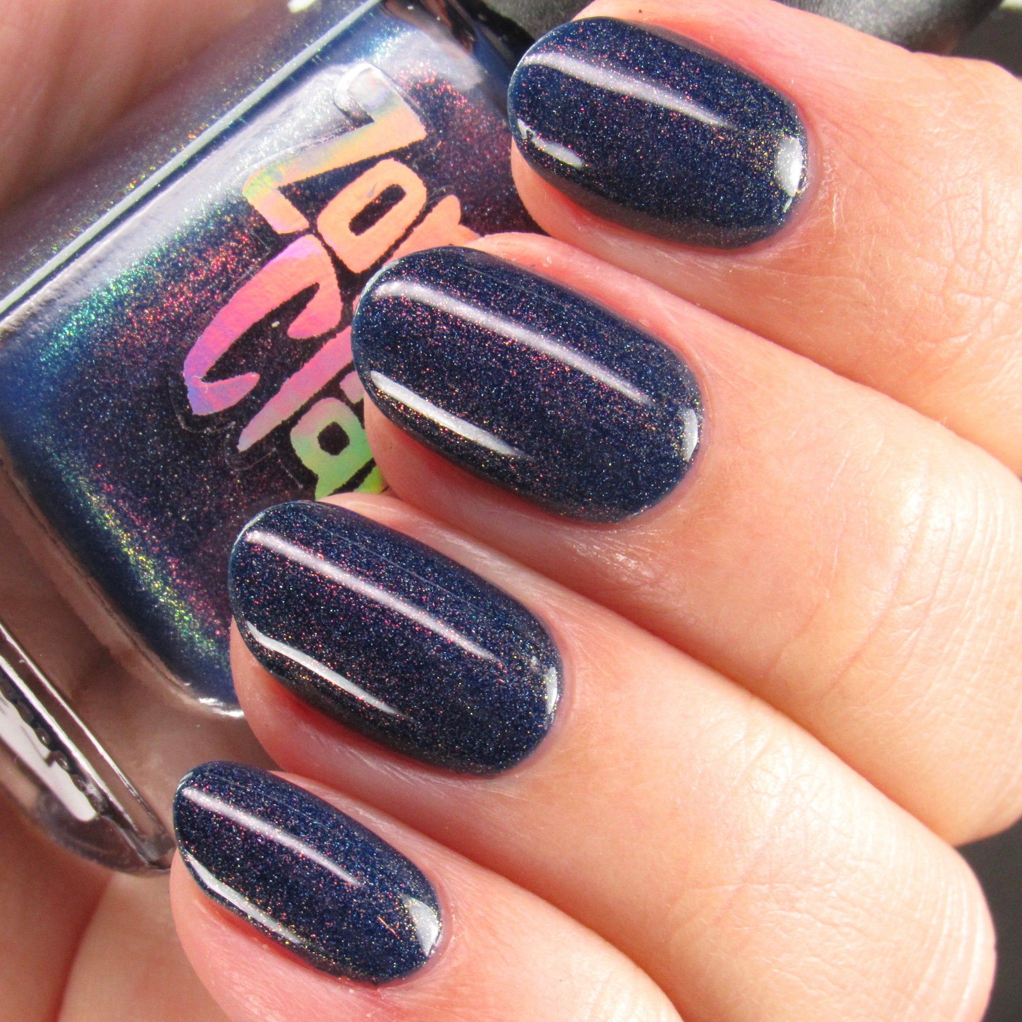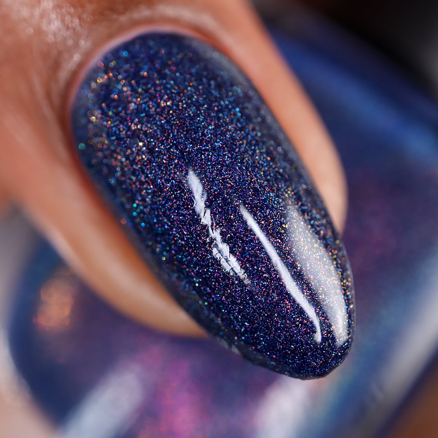 A sapphire blue base with orange/red/green shimmer and scattered holo.