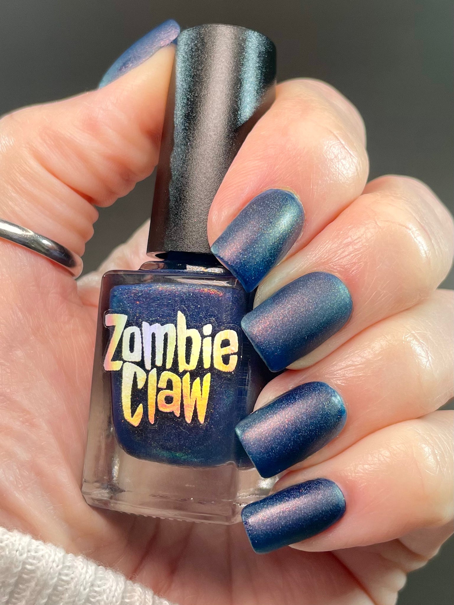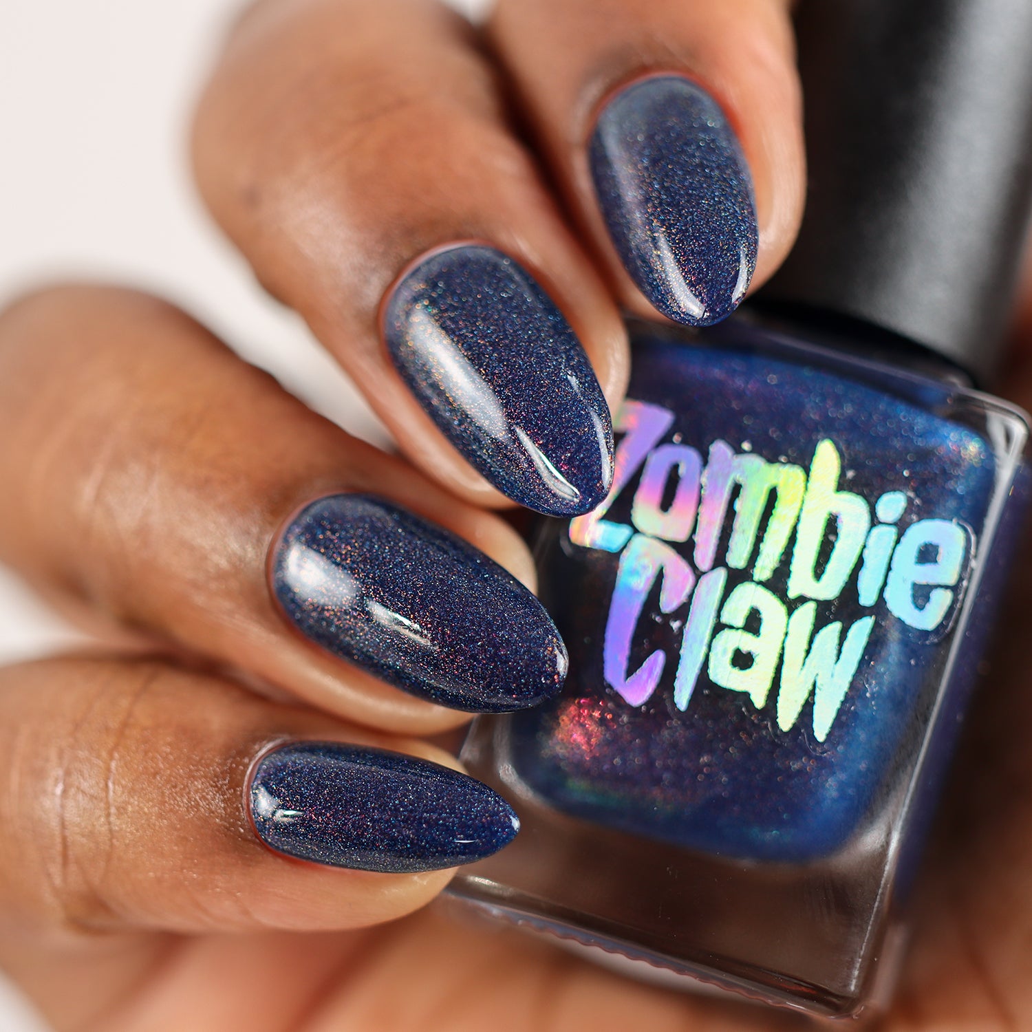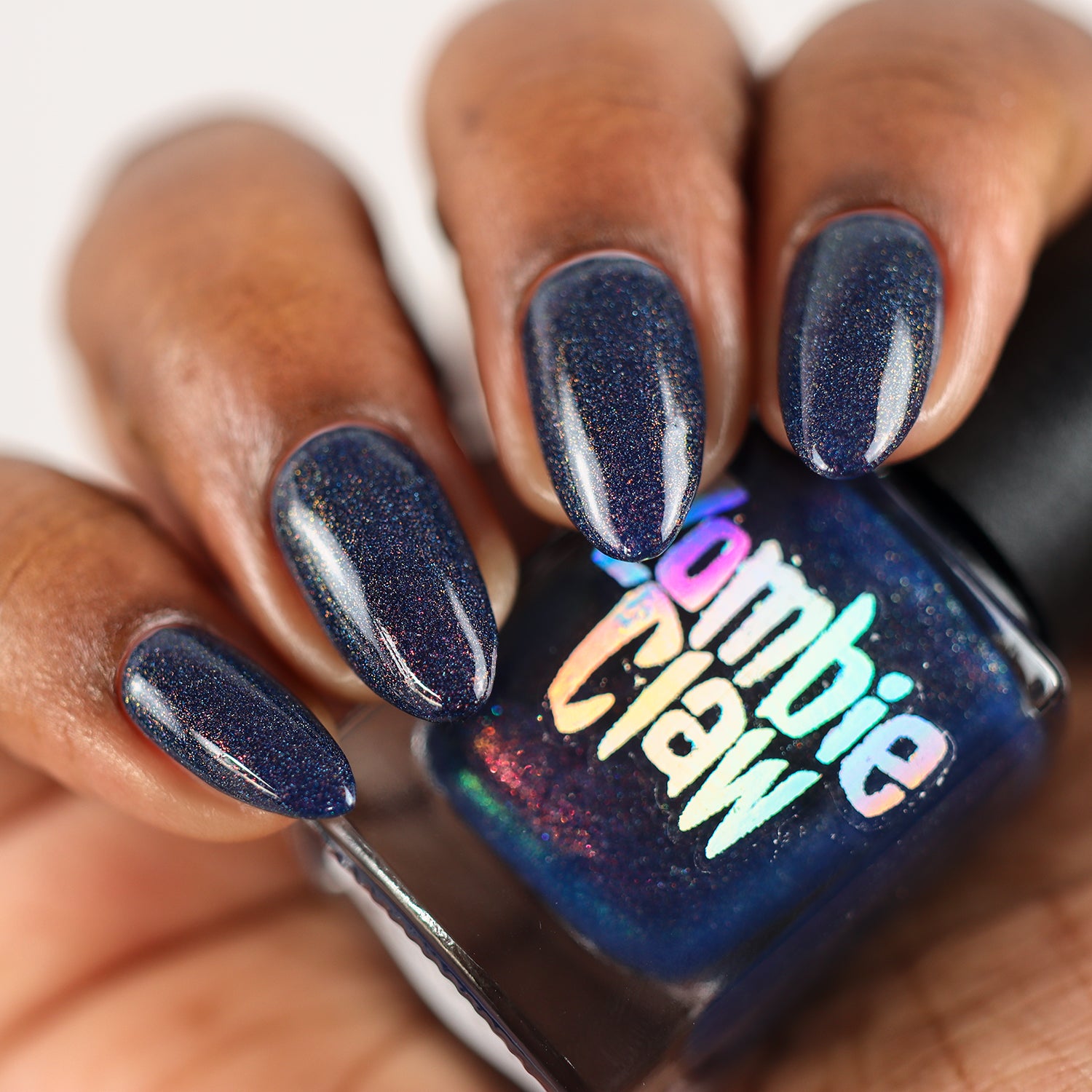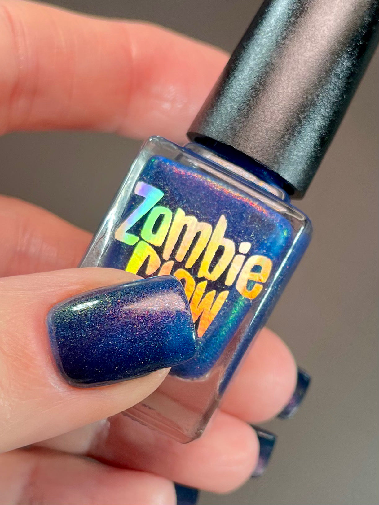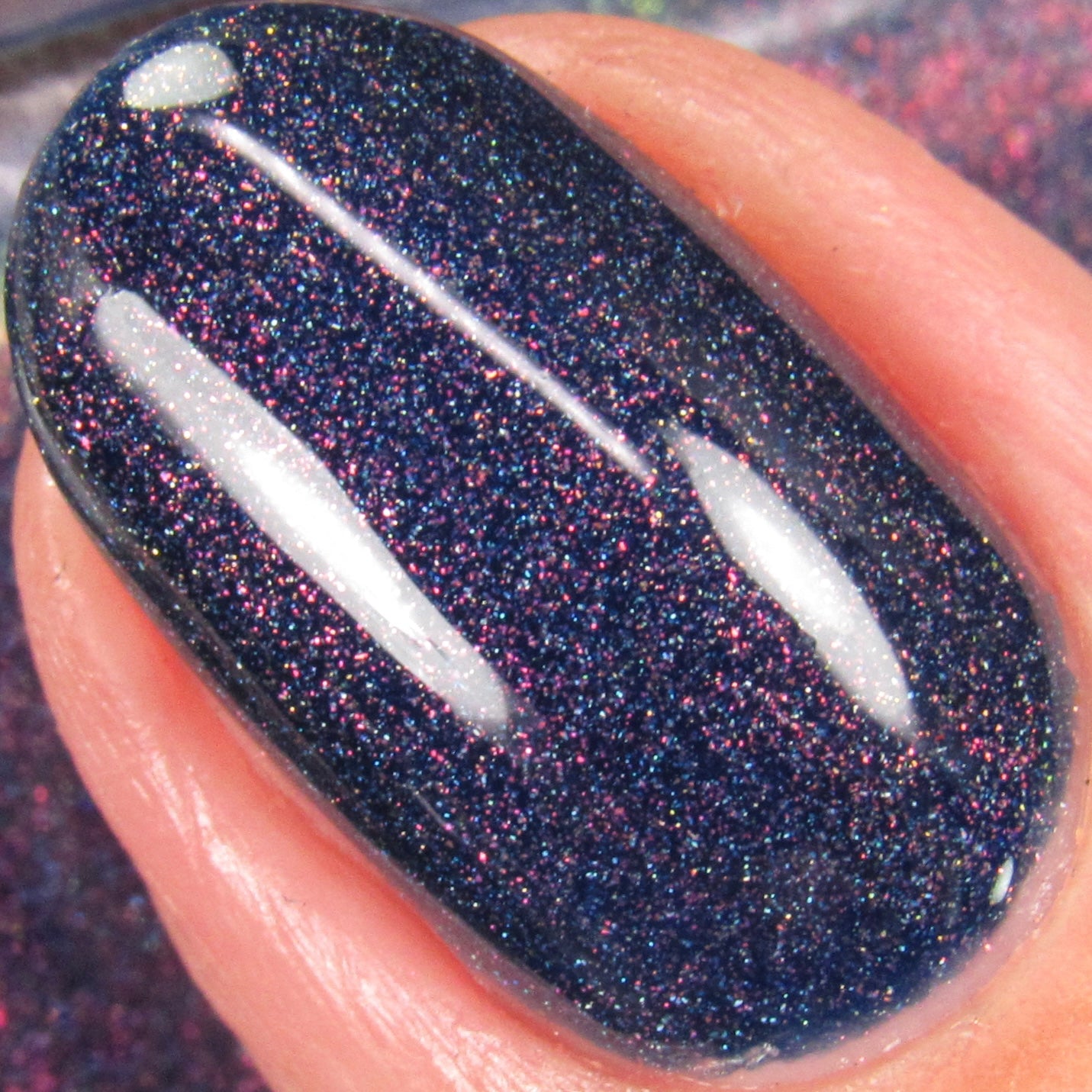 A sapphire blue base with orange/red/green shimmer and scattered holo.