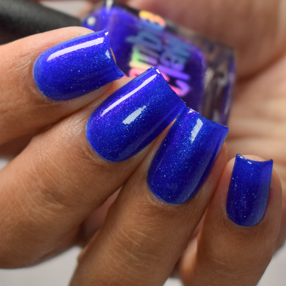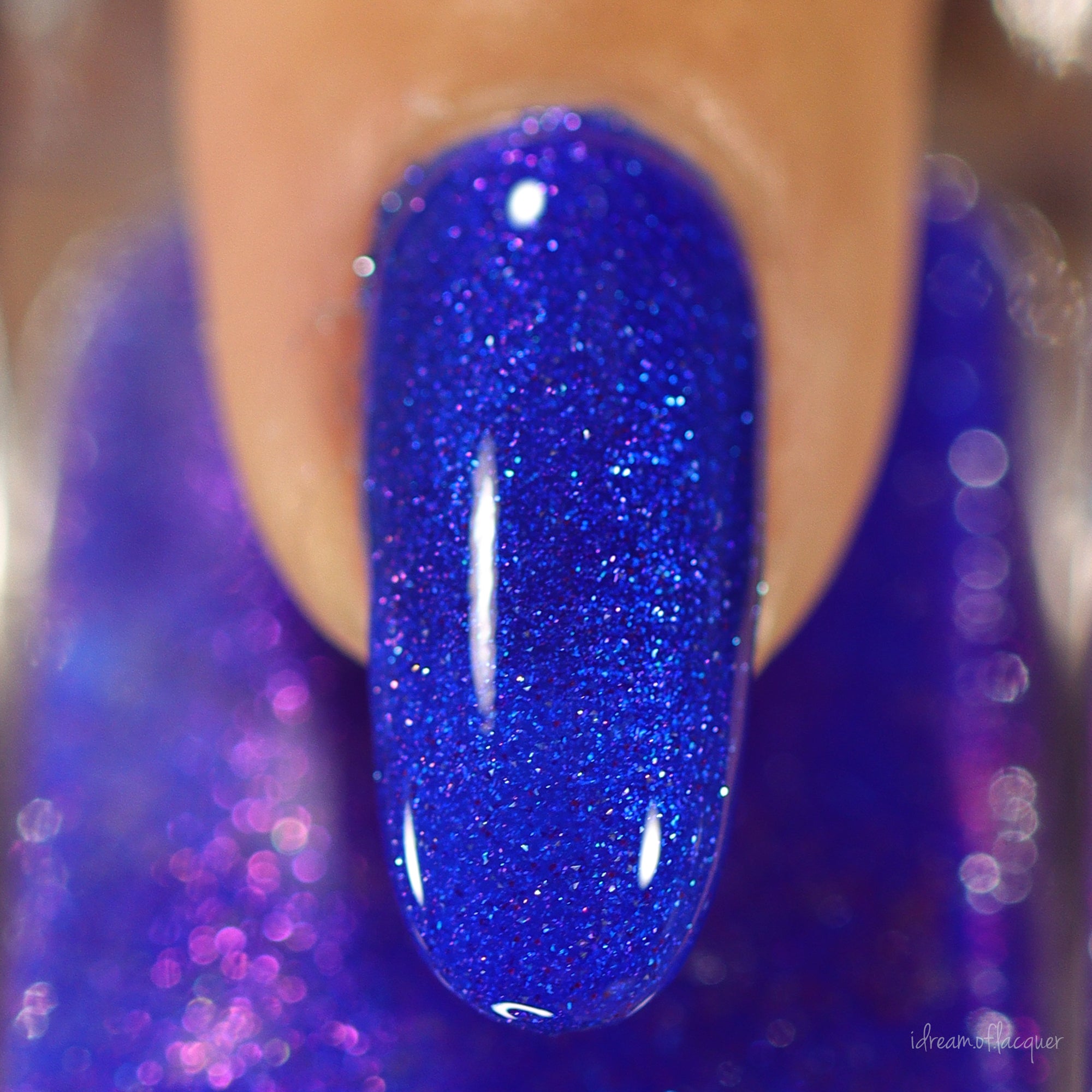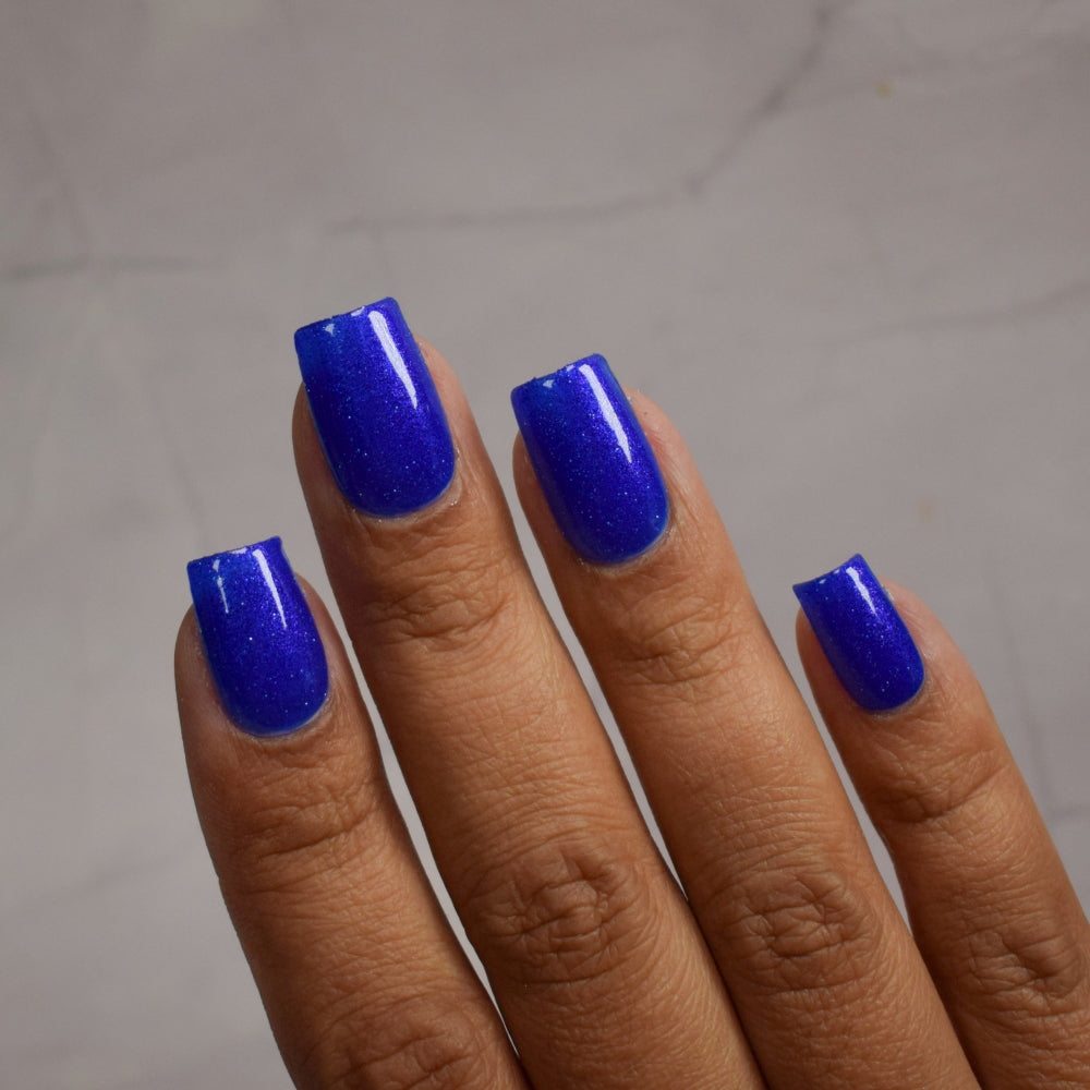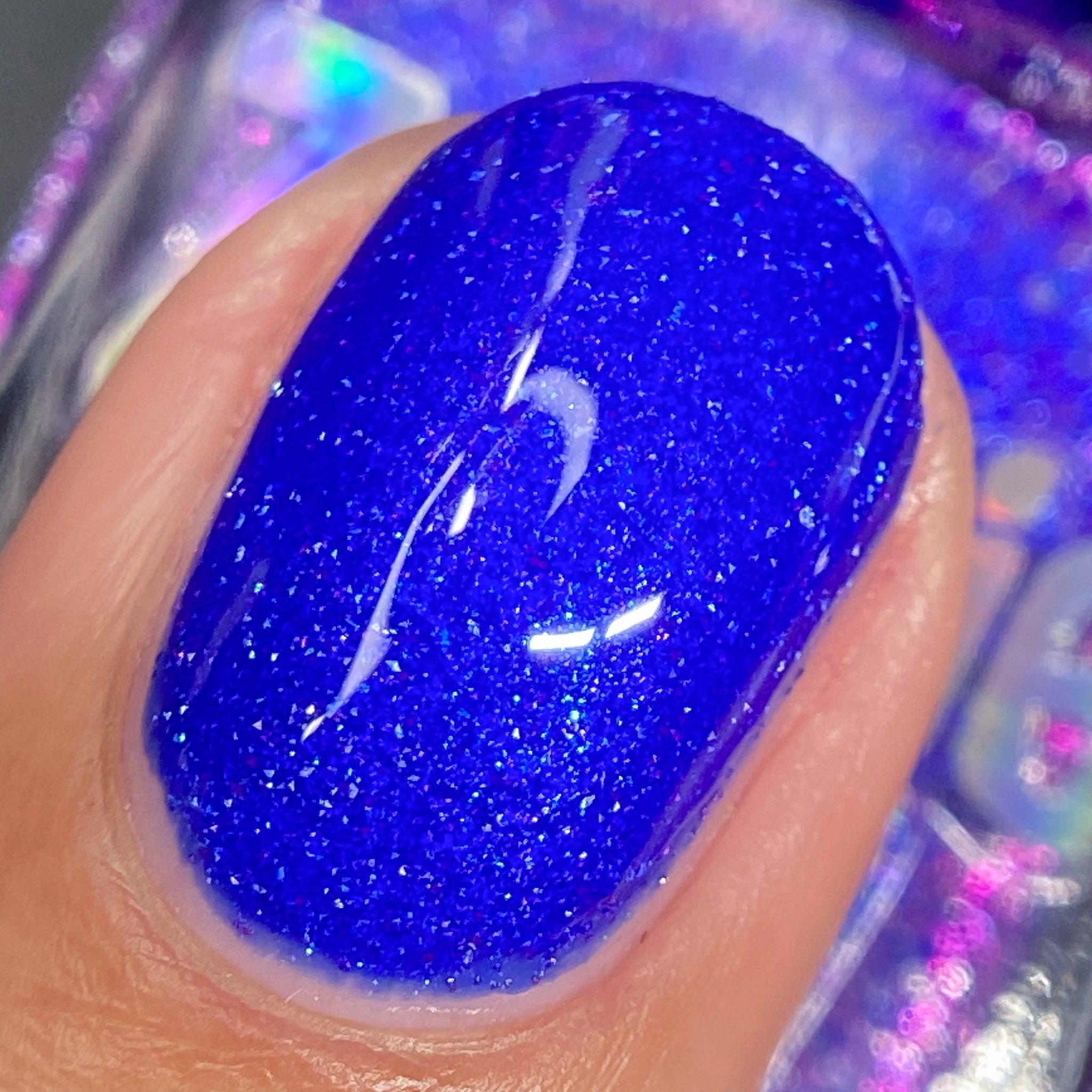 A vibrant blue with silver and purple reflective glitter with a touch of purple-pink aurora shimmer