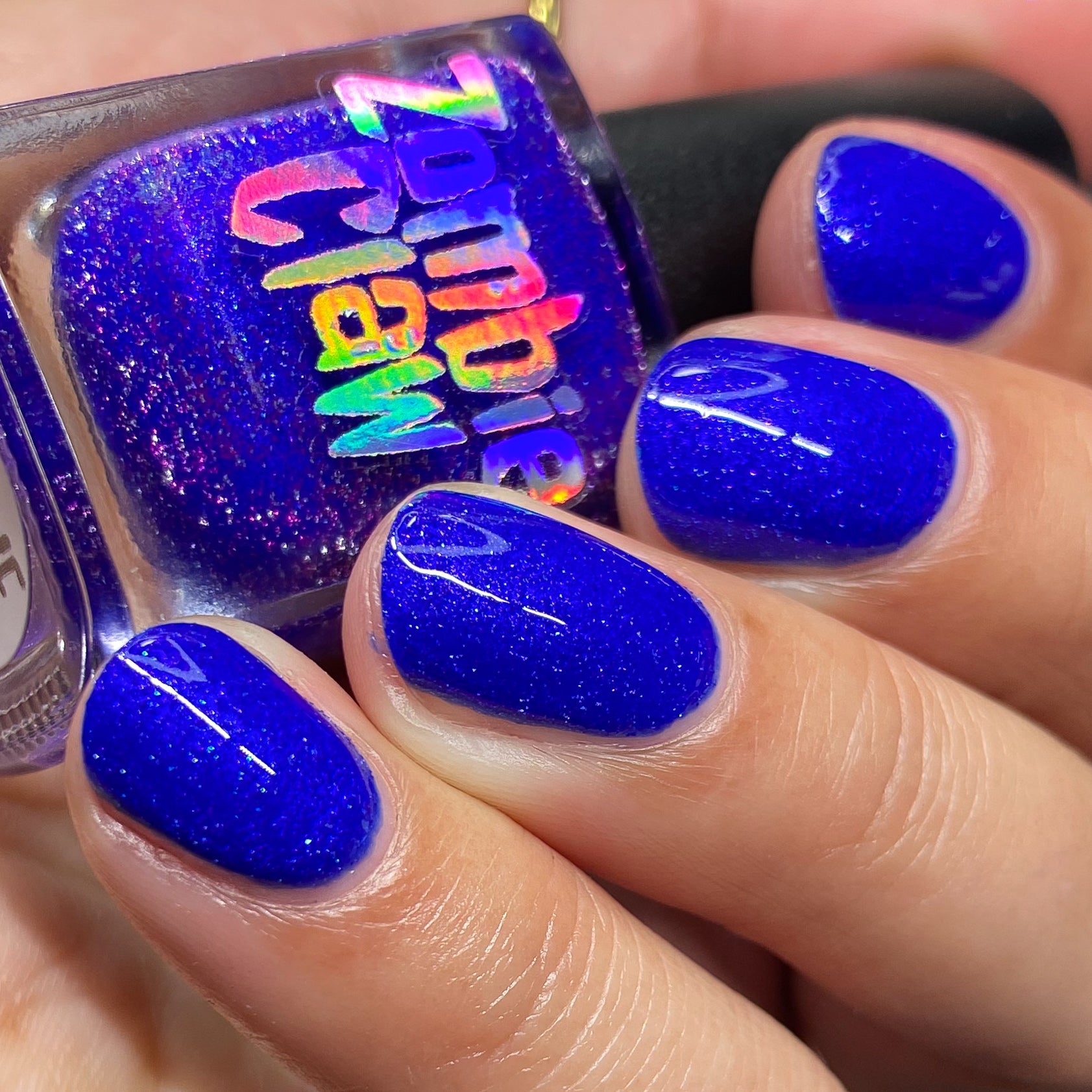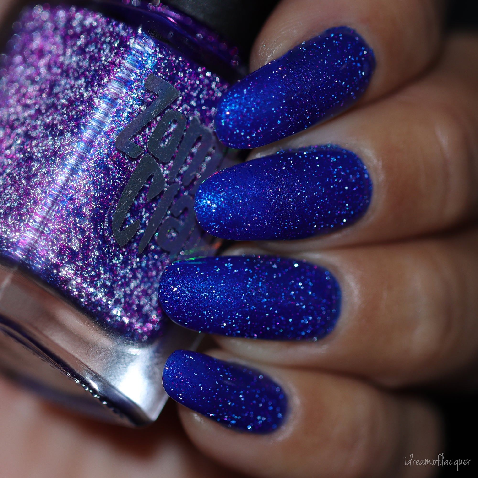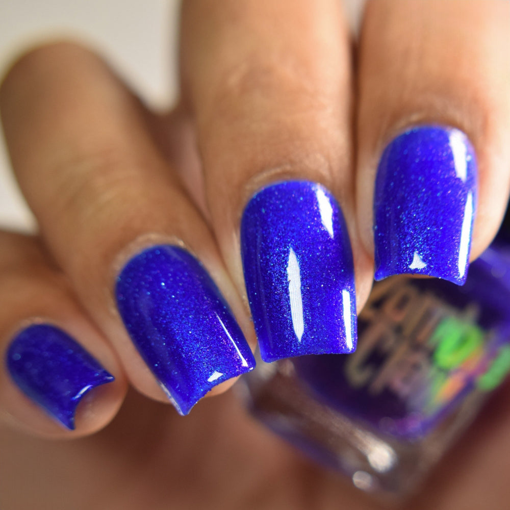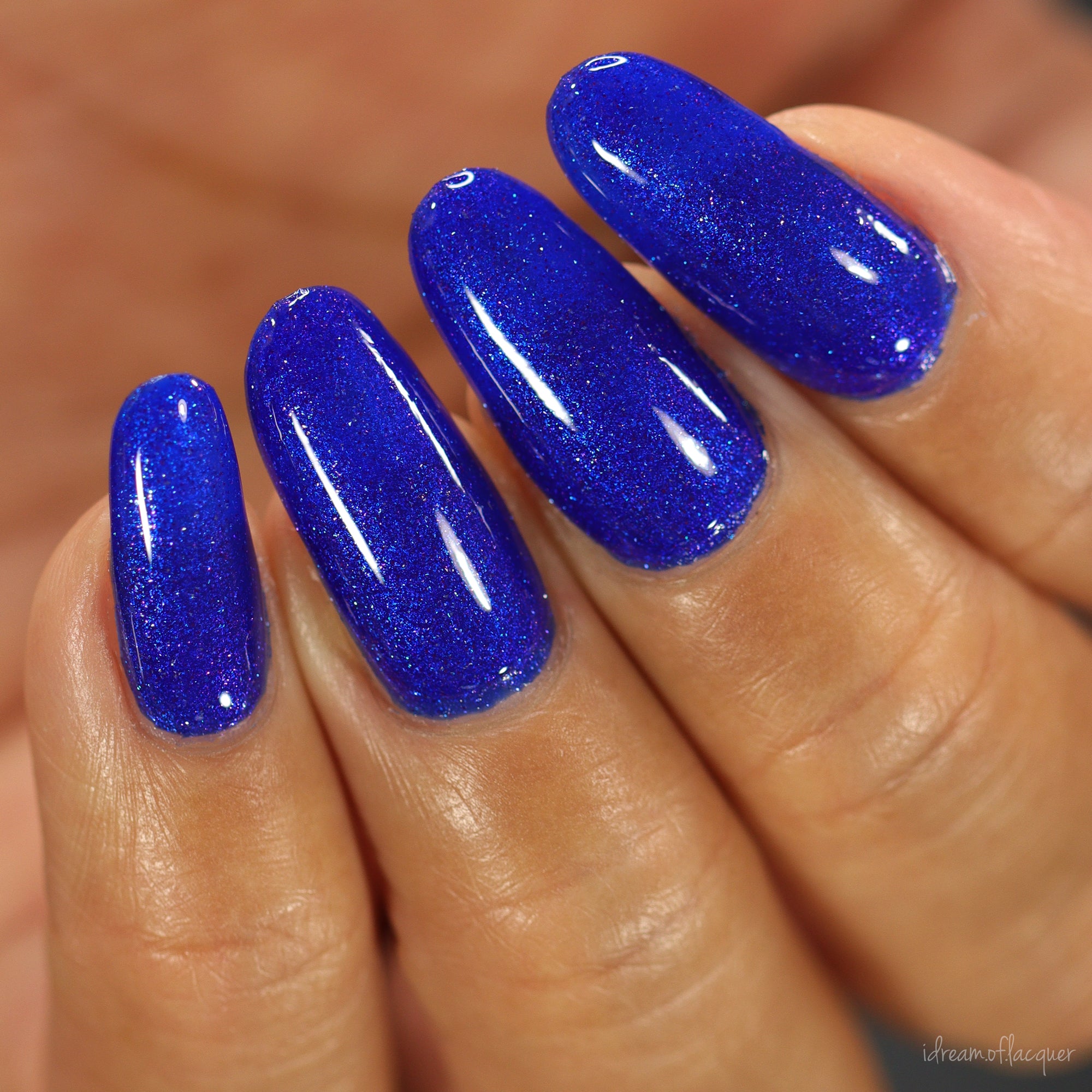A vibrant blue with silver and purple reflective glitter with a touch of purple-pink aurora shimmer