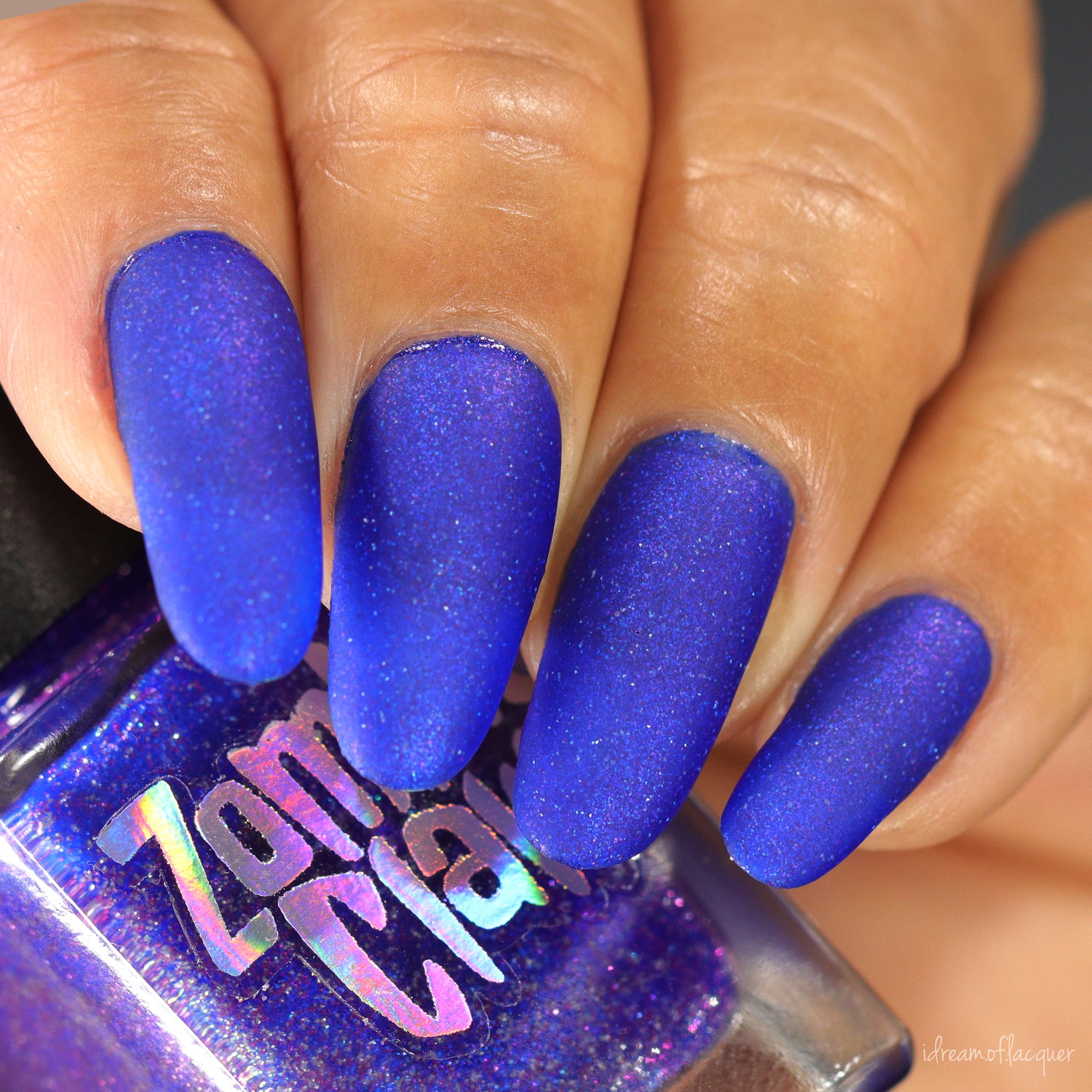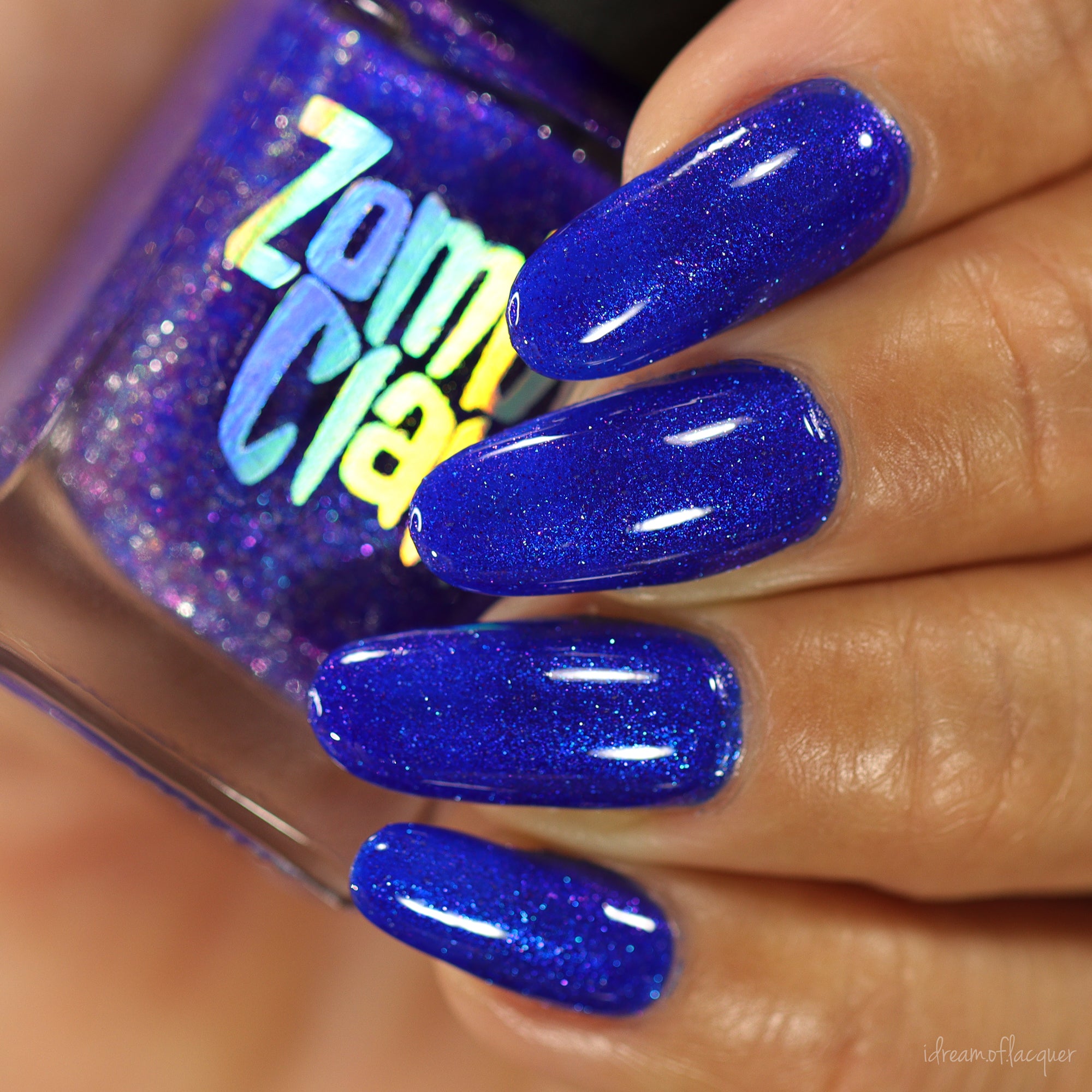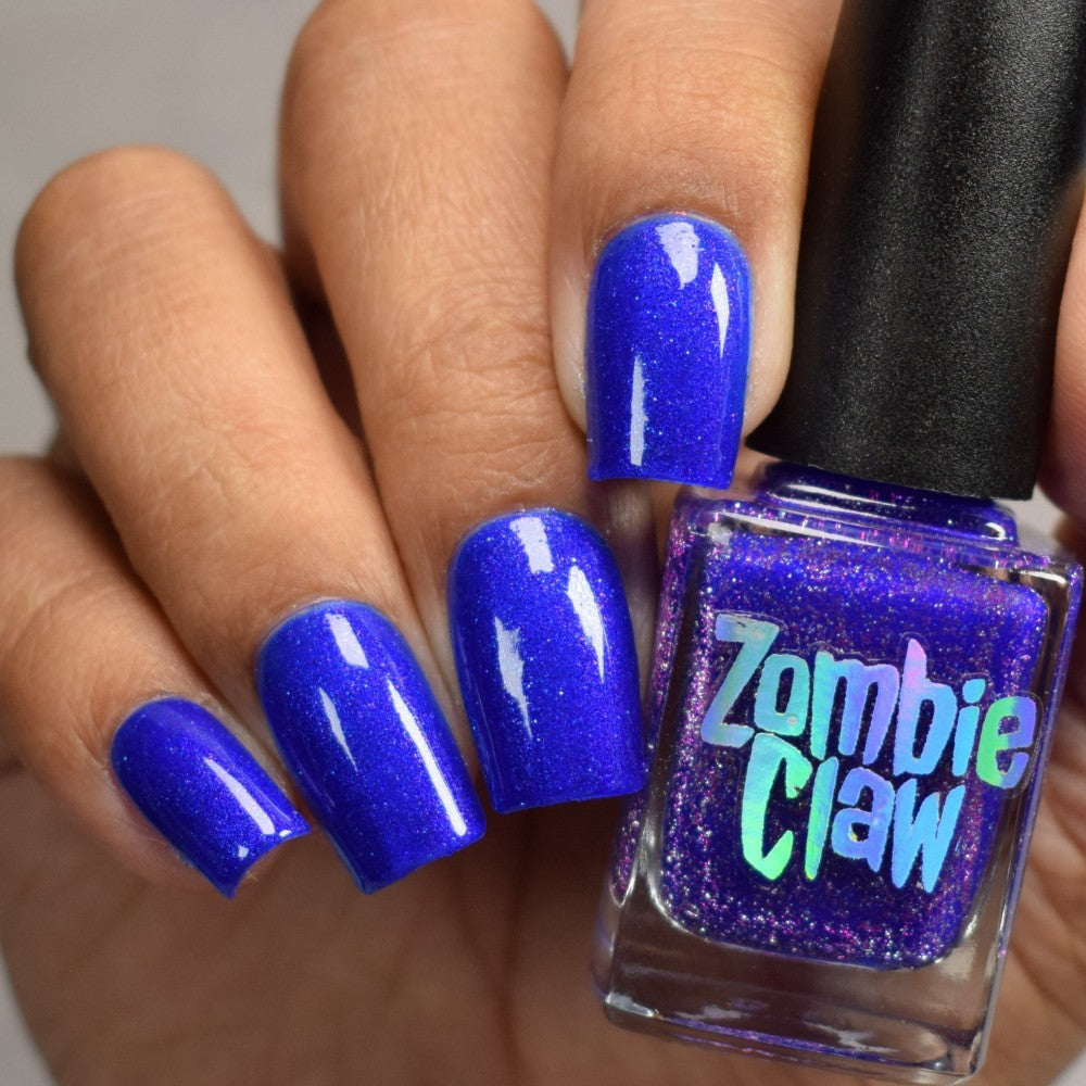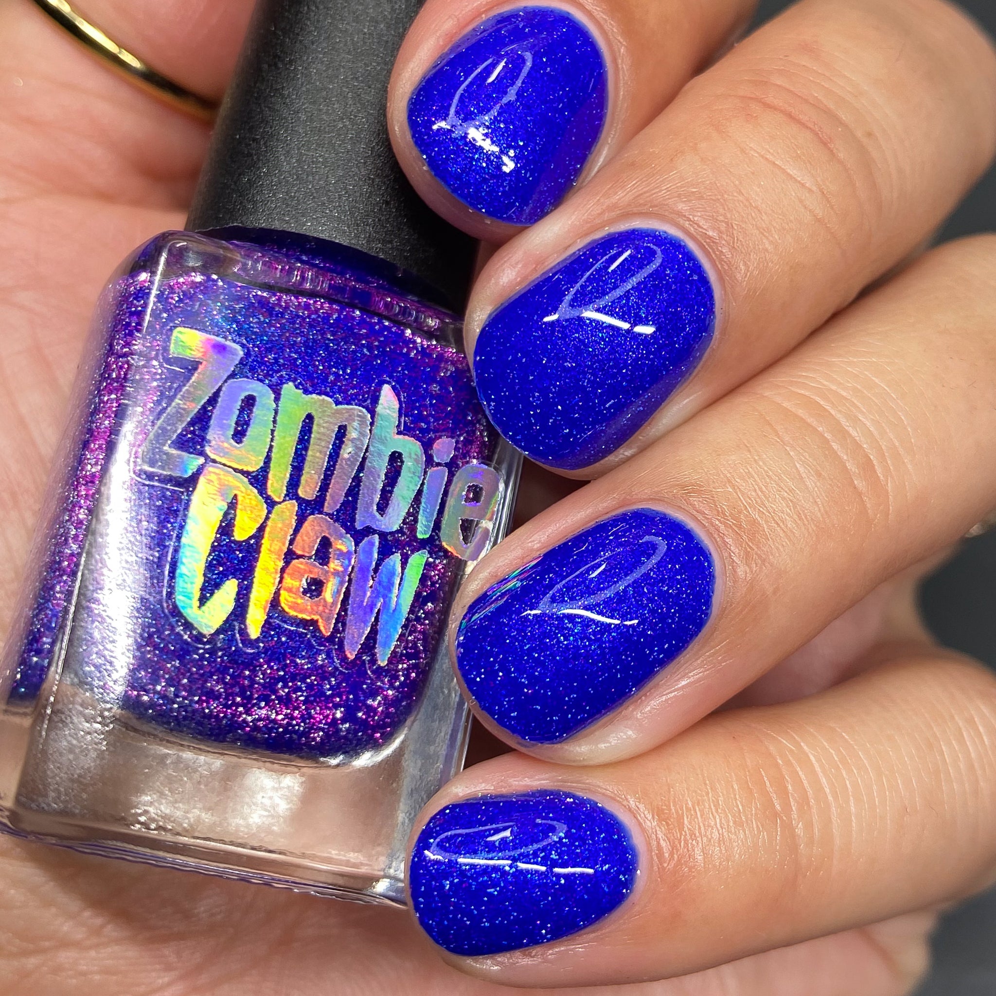 A vibrant blue with silver and purple reflective glitter with a touch of purple-pink aurora shimmer