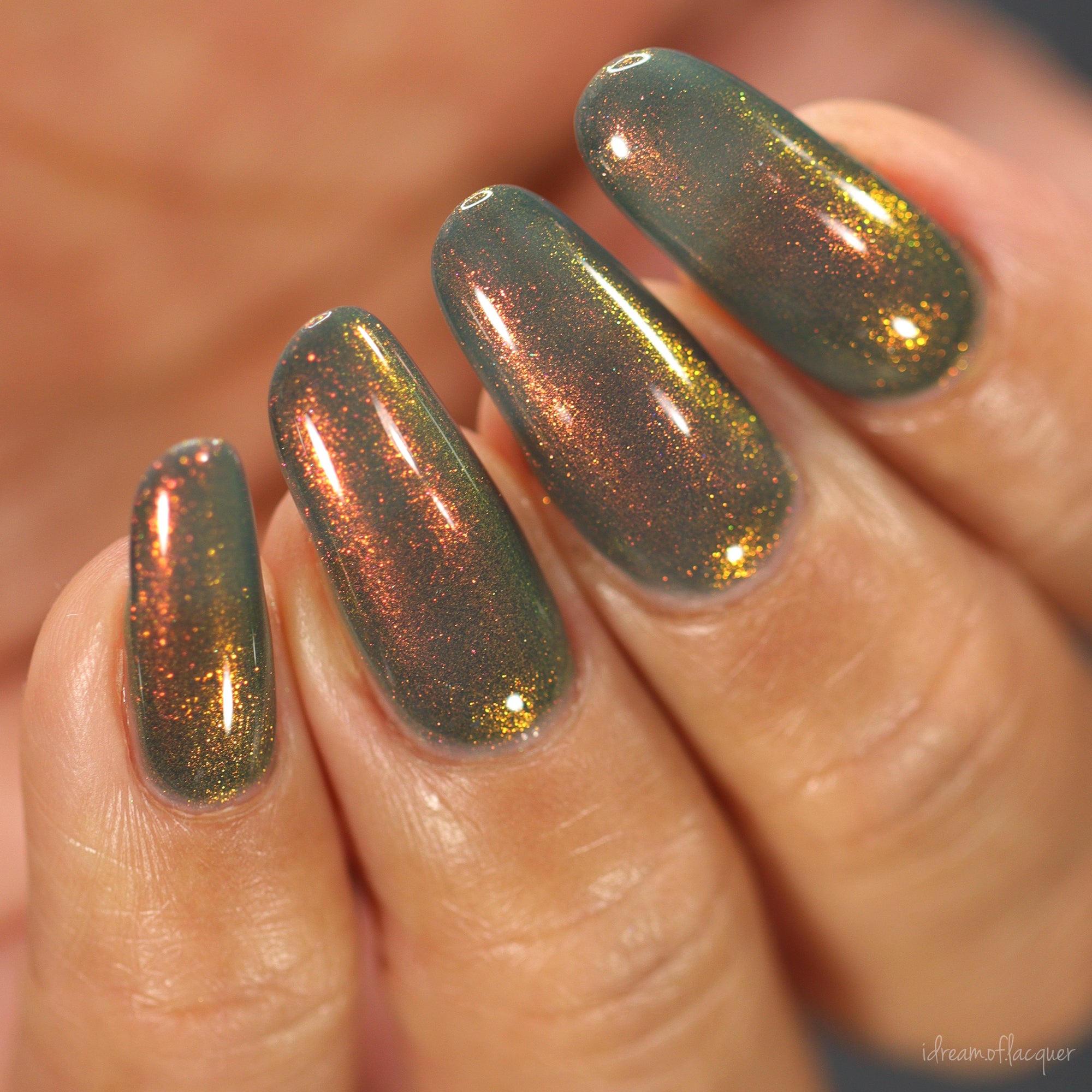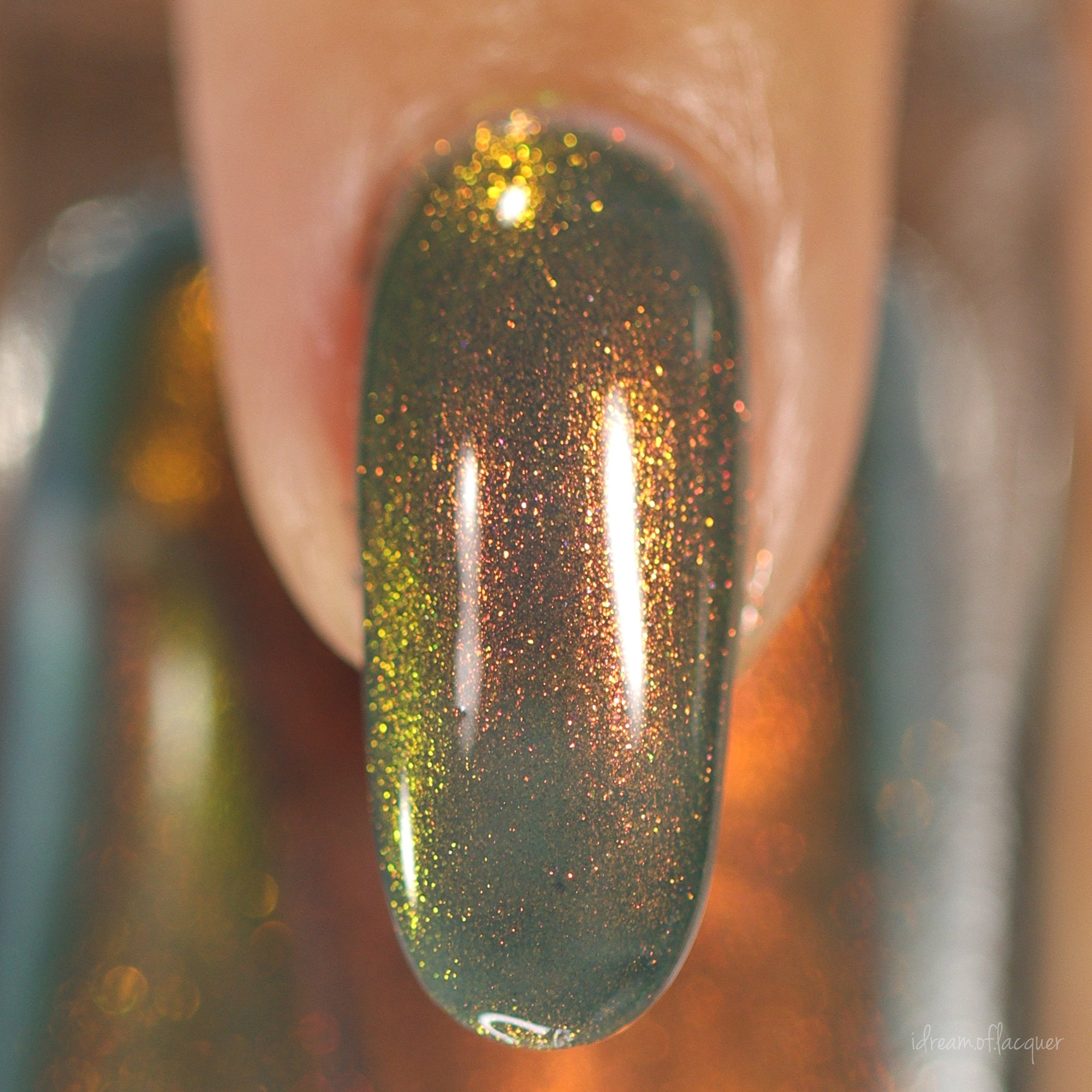 A deep sapphire base with orange-gold-green shimmers.