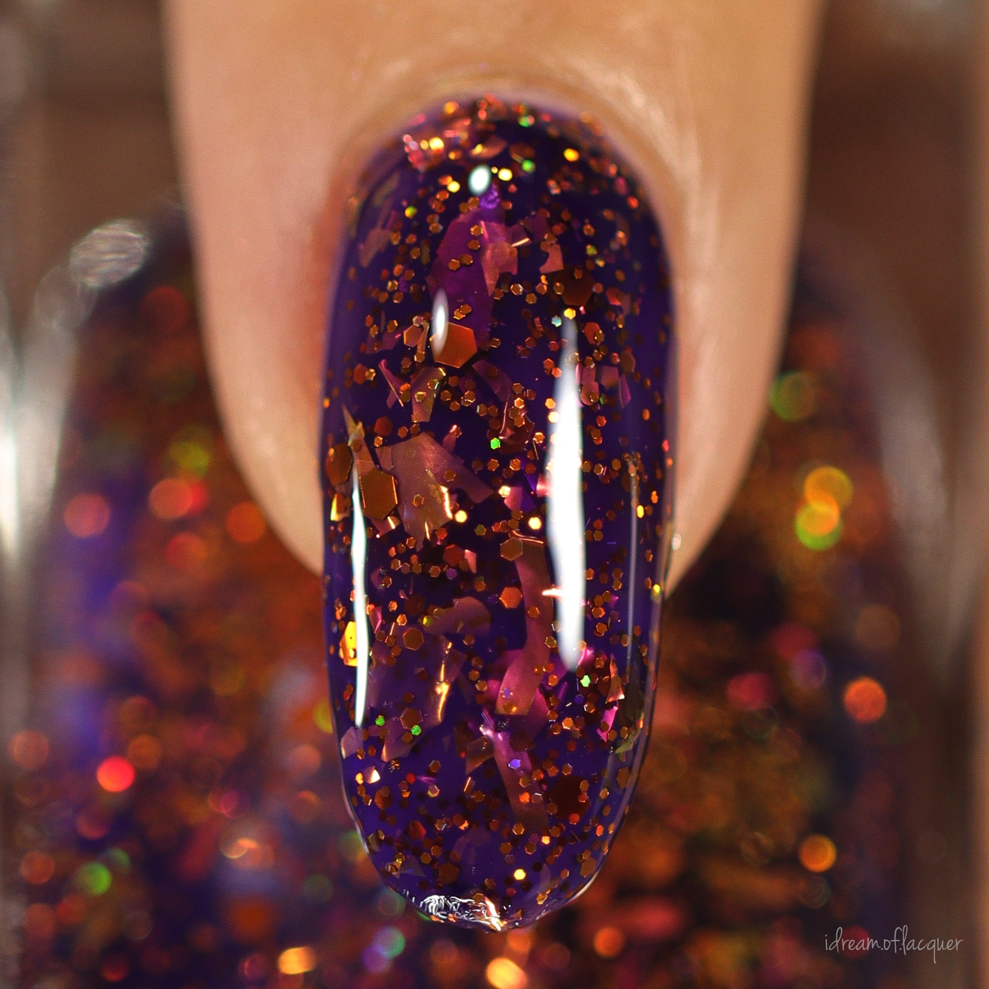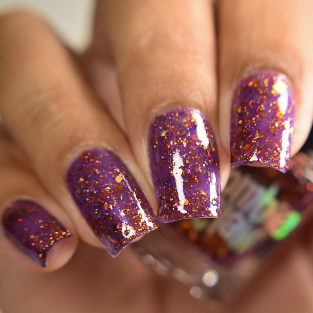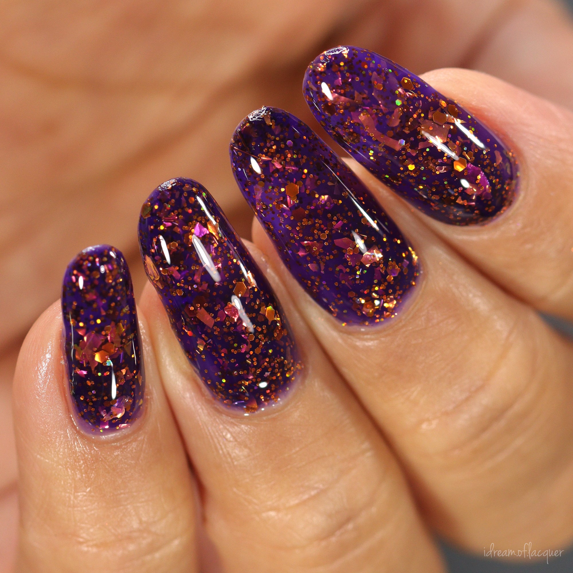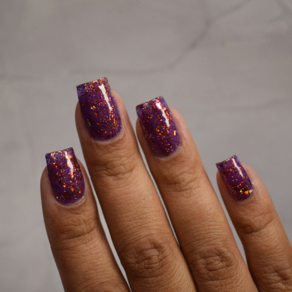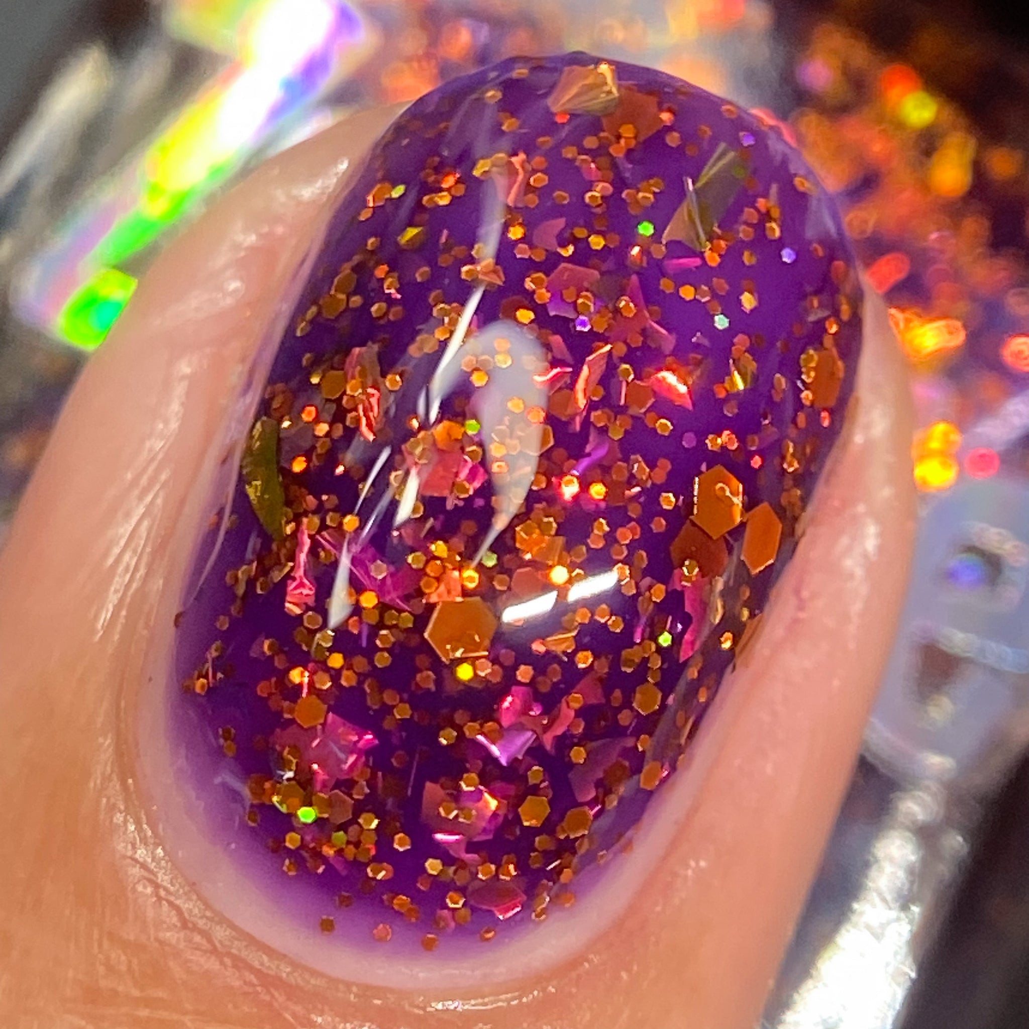 An indigo base with orange holo glitters and red-orange-peach flakies.