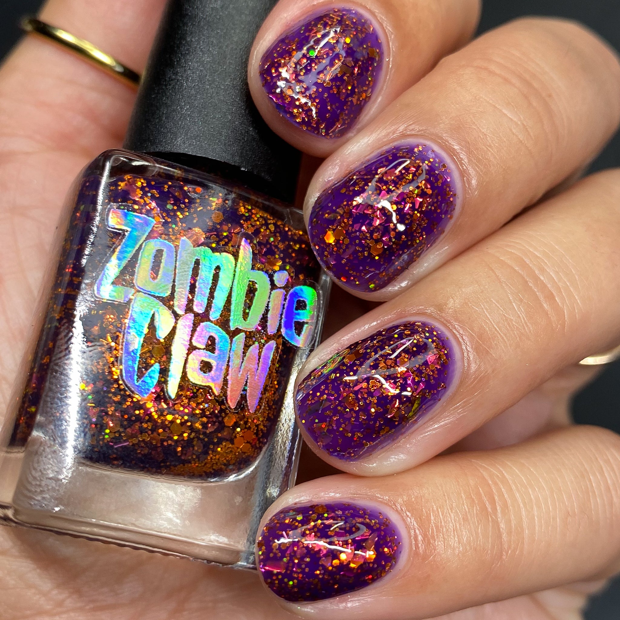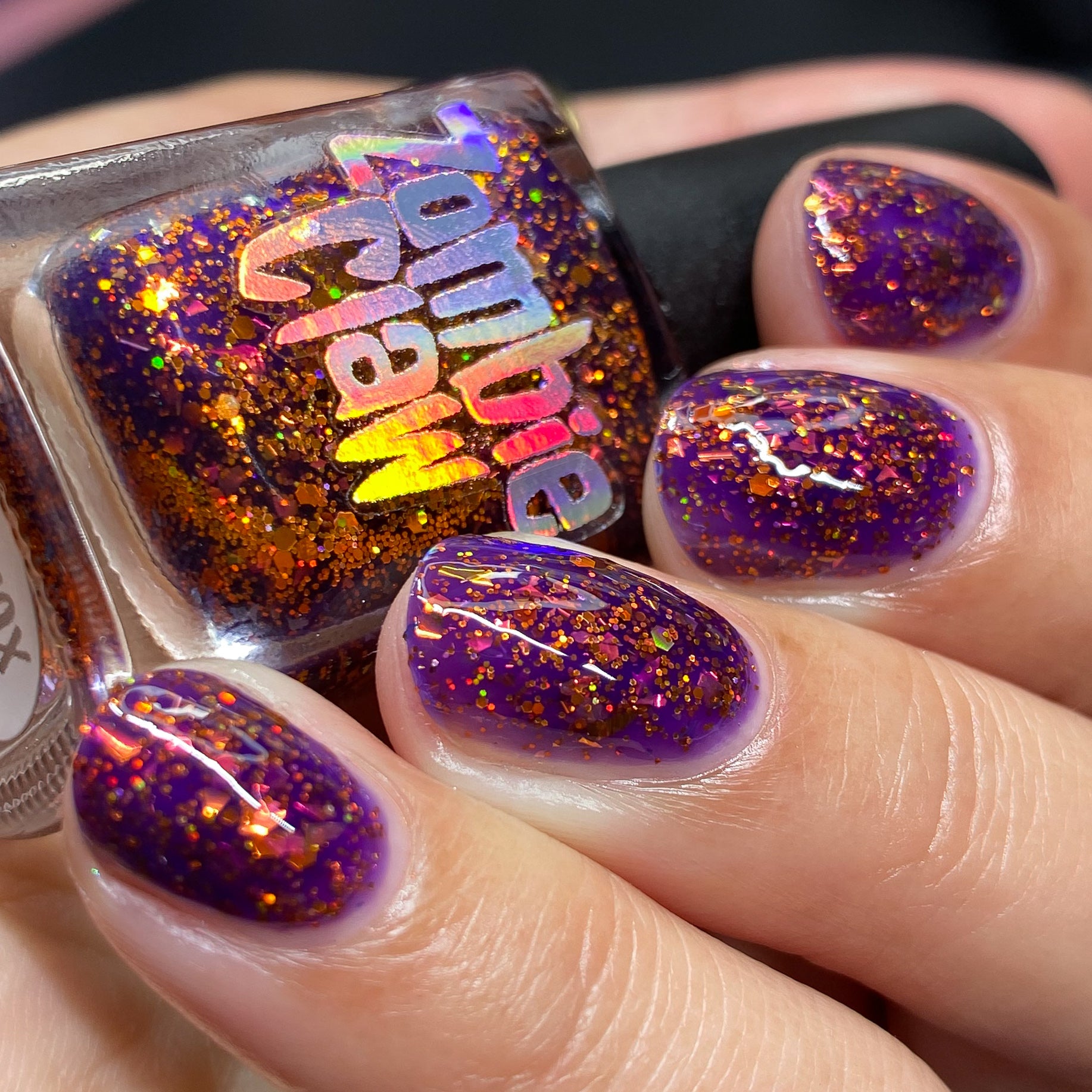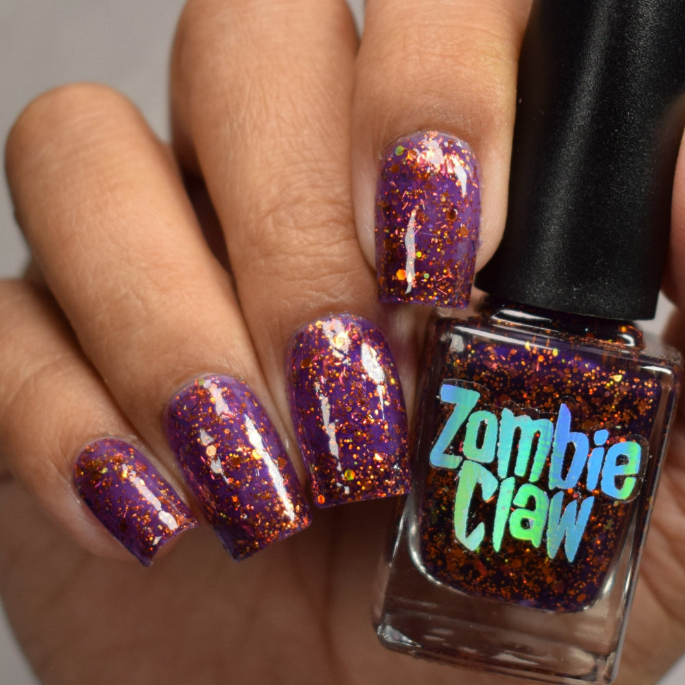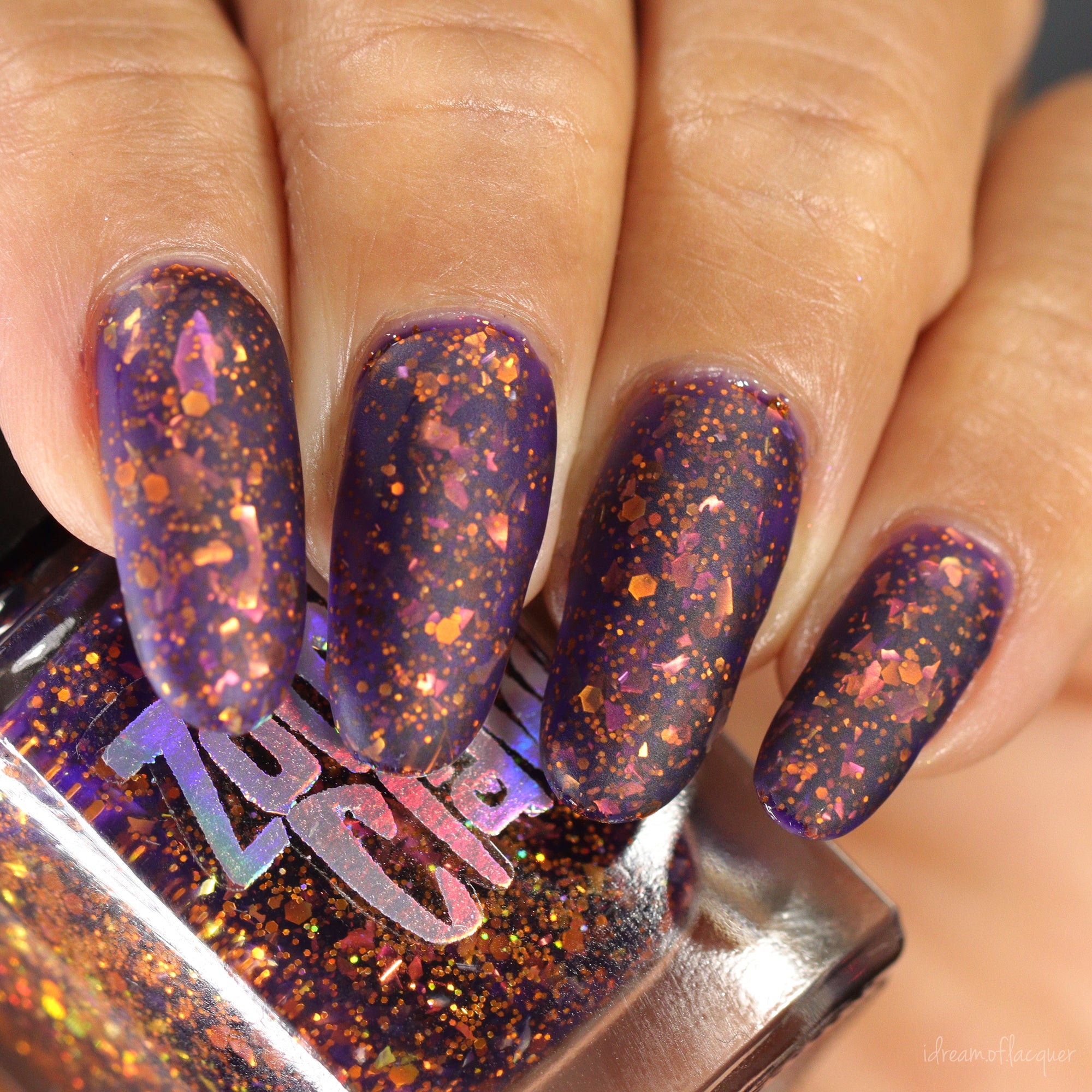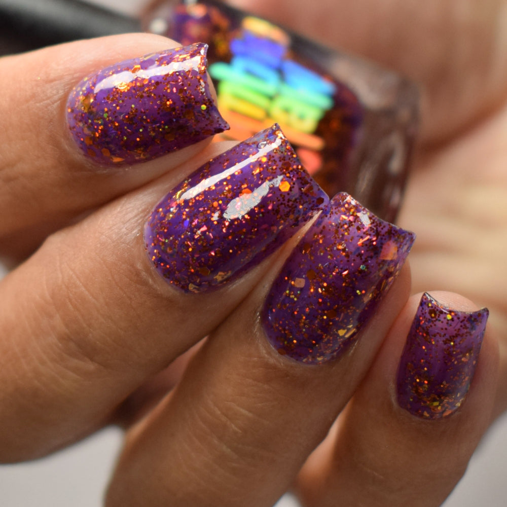An indigo base with orange holo glitters and red-orange-peach flakies.