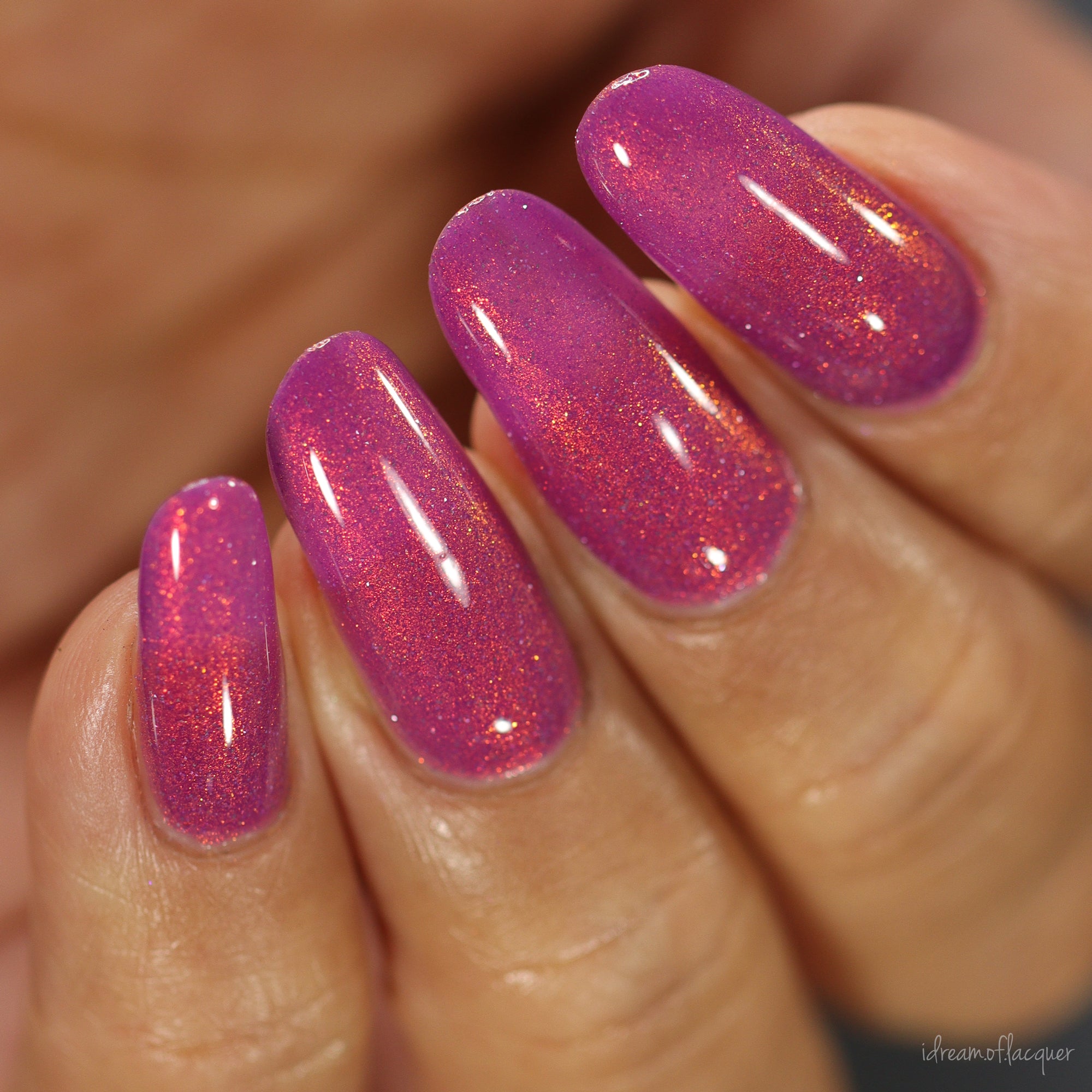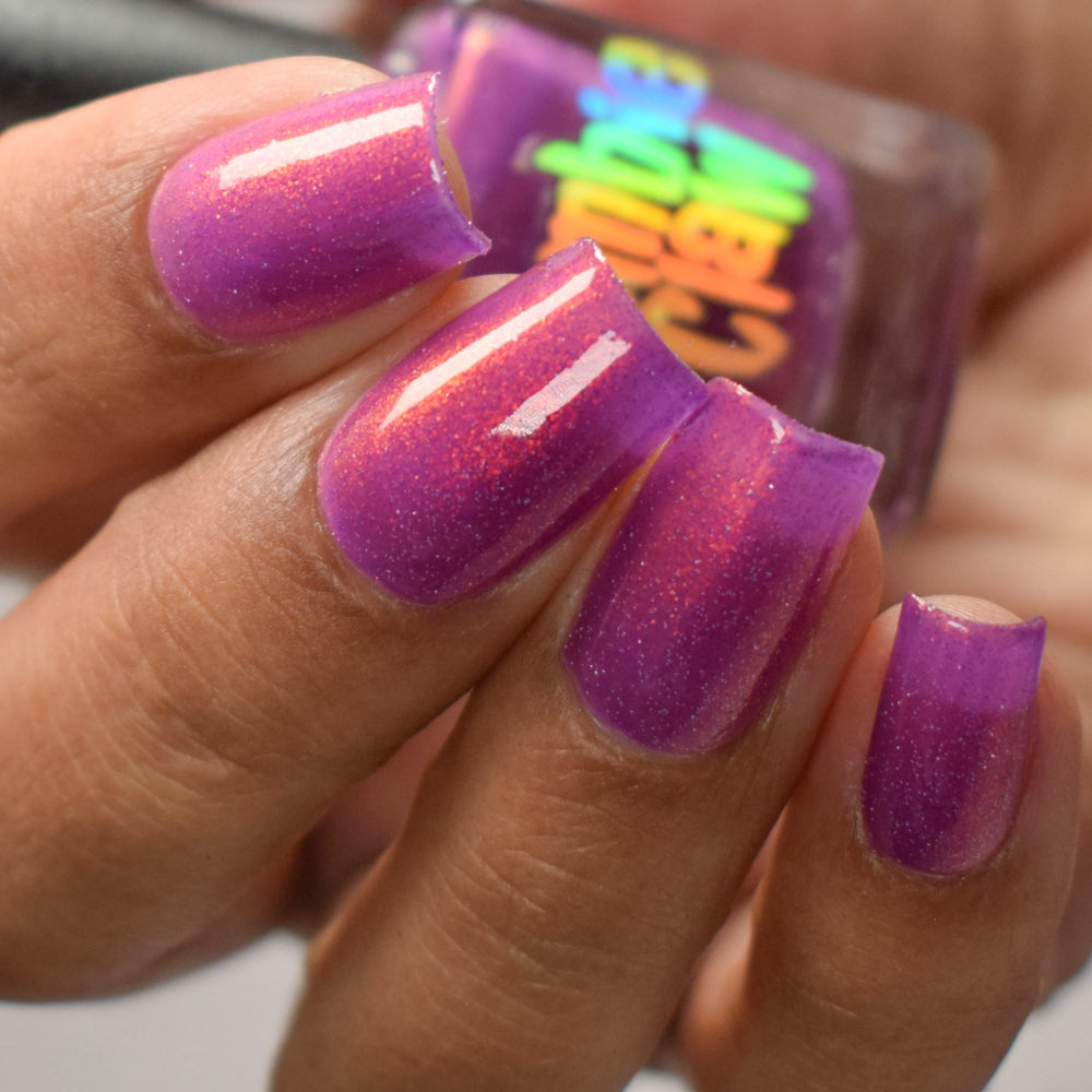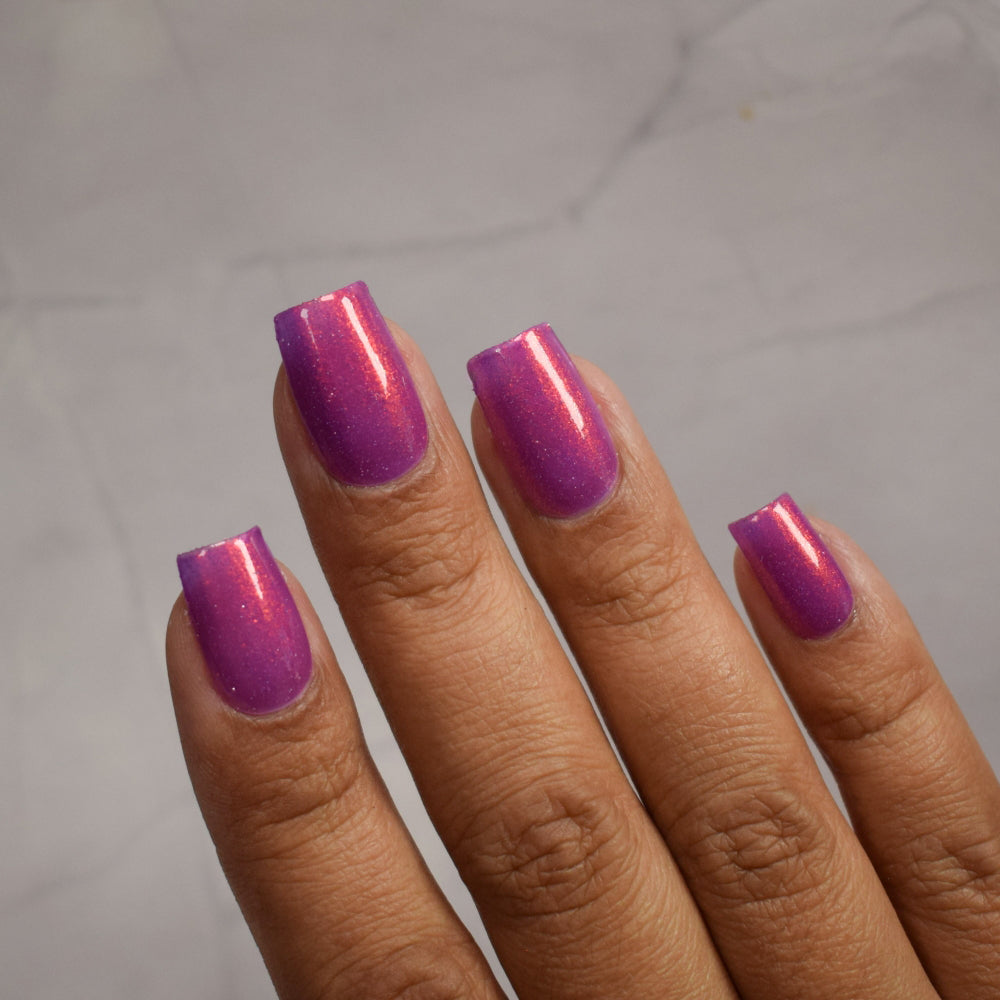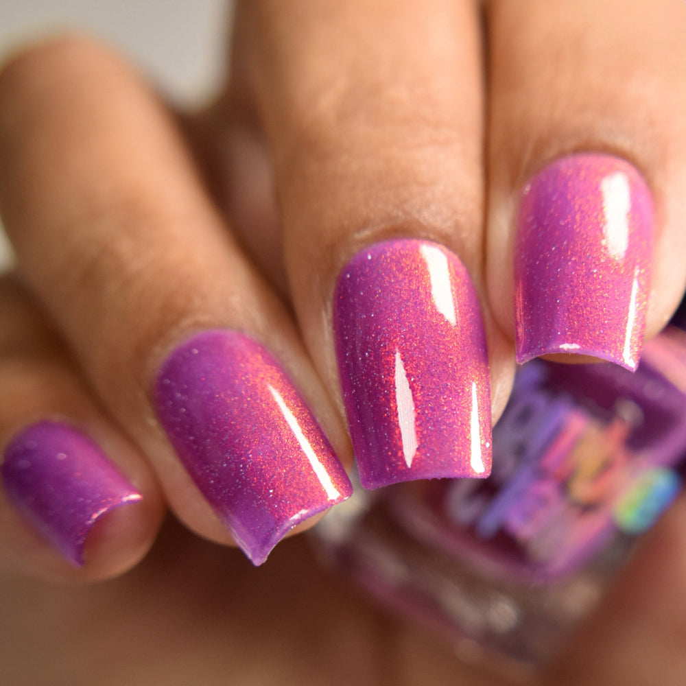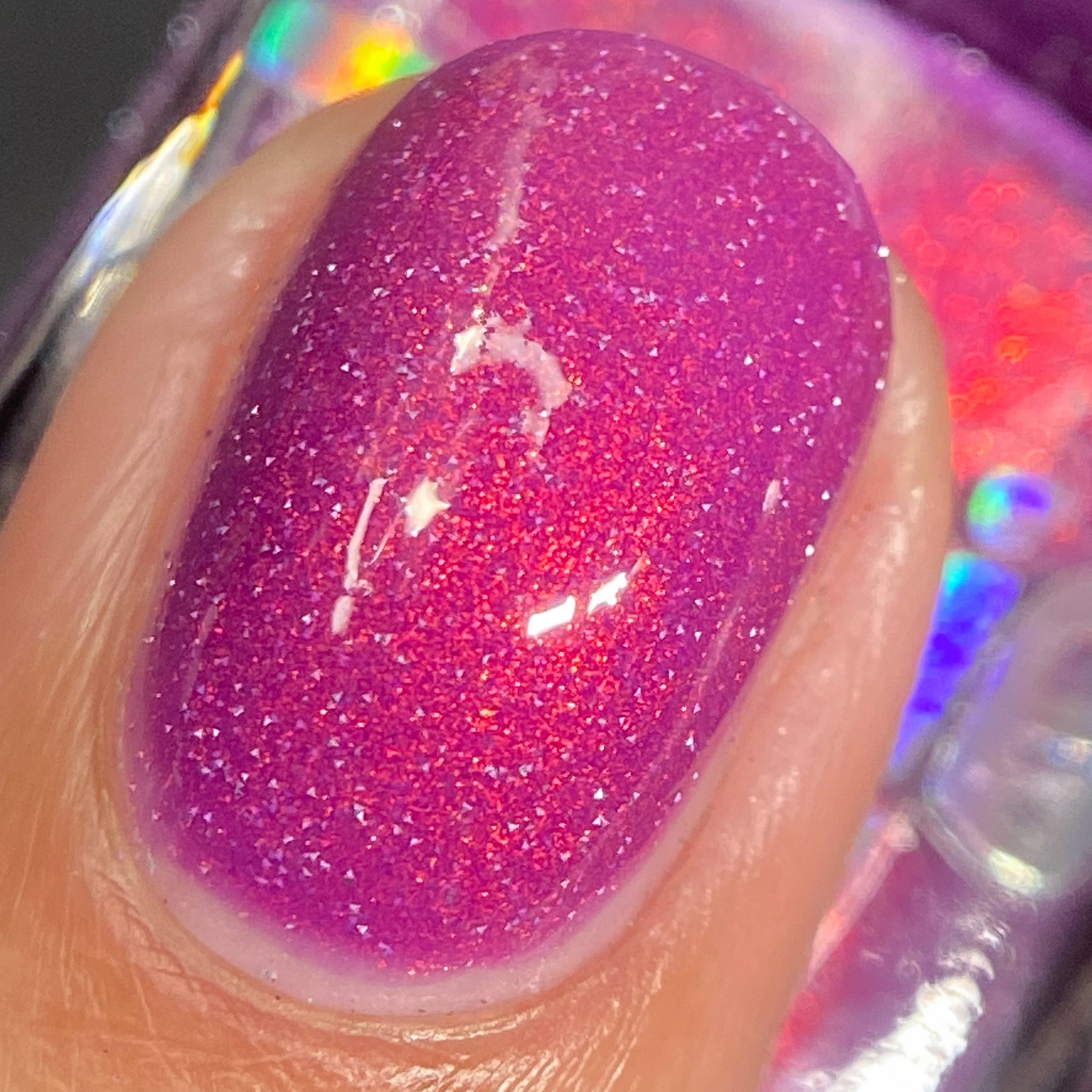 A periwinkle base with red-gold electric shimmer and silver reflective glitters.