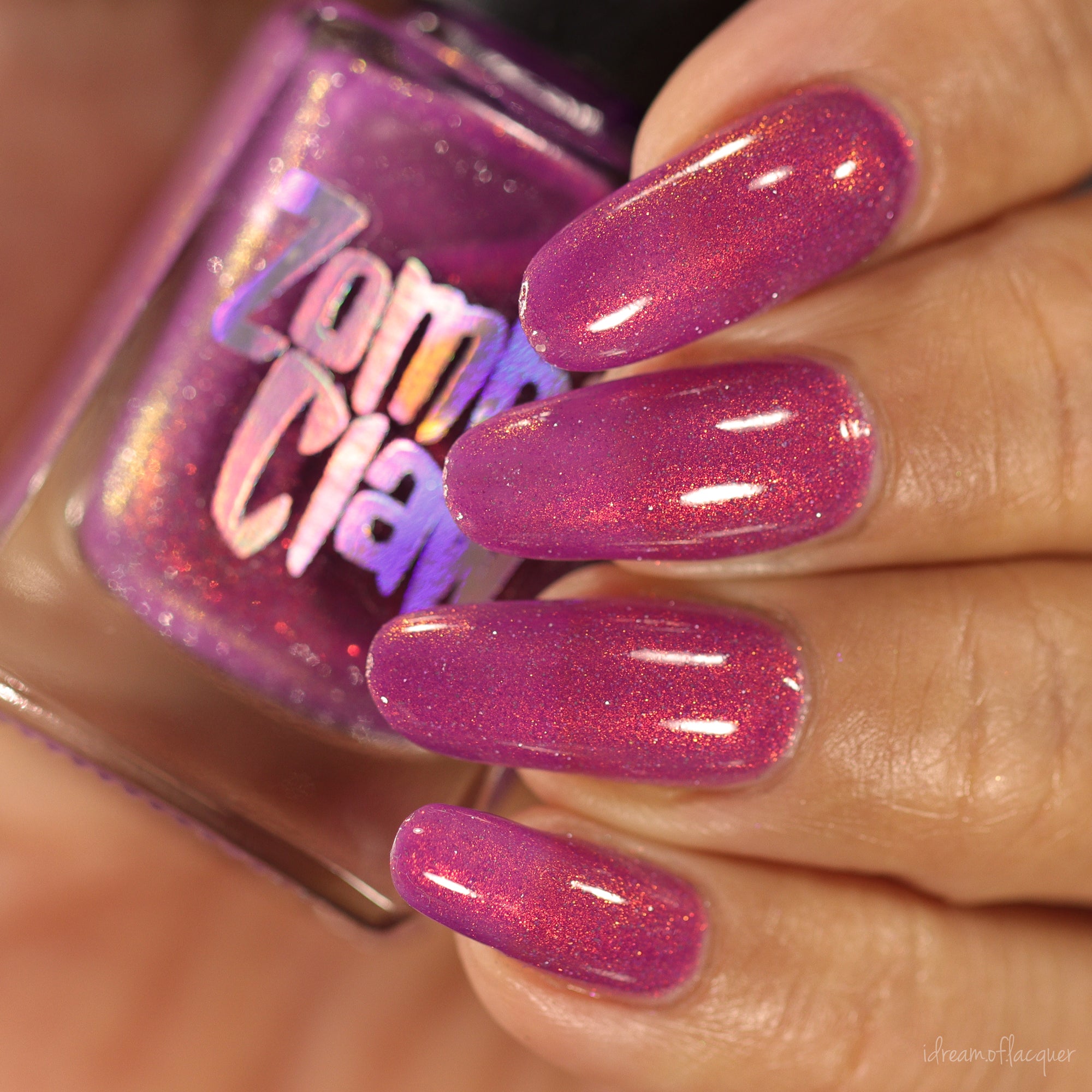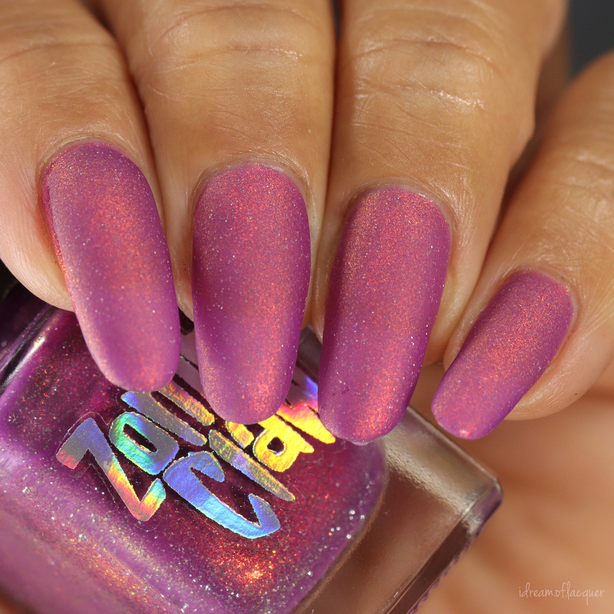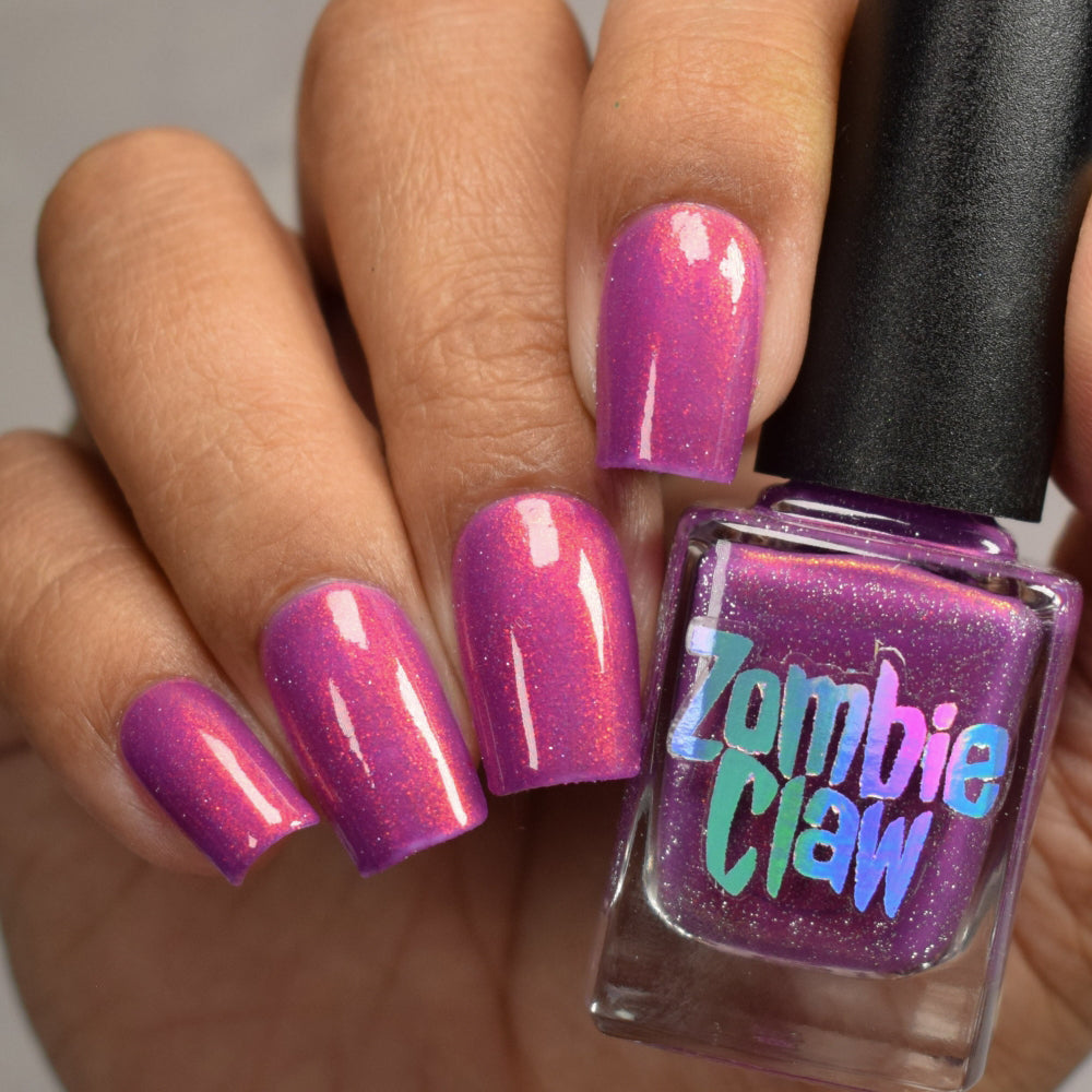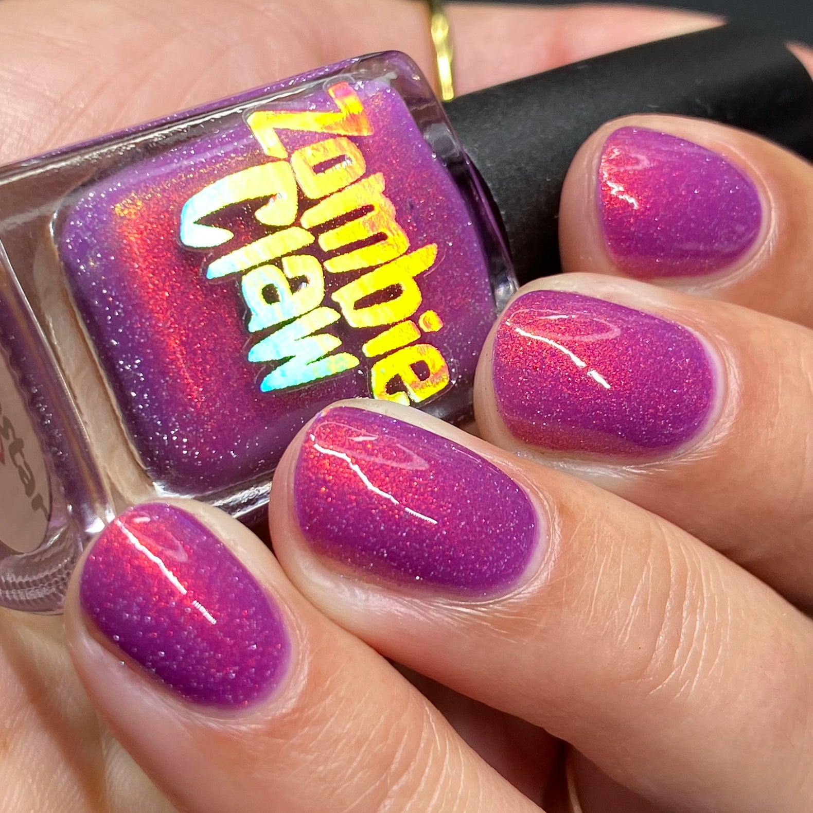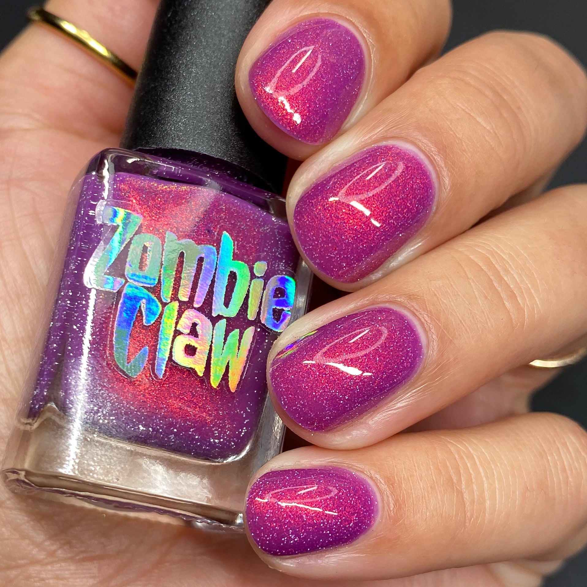 A periwinkle base with red-gold electric shimmer and silver reflective glitters.