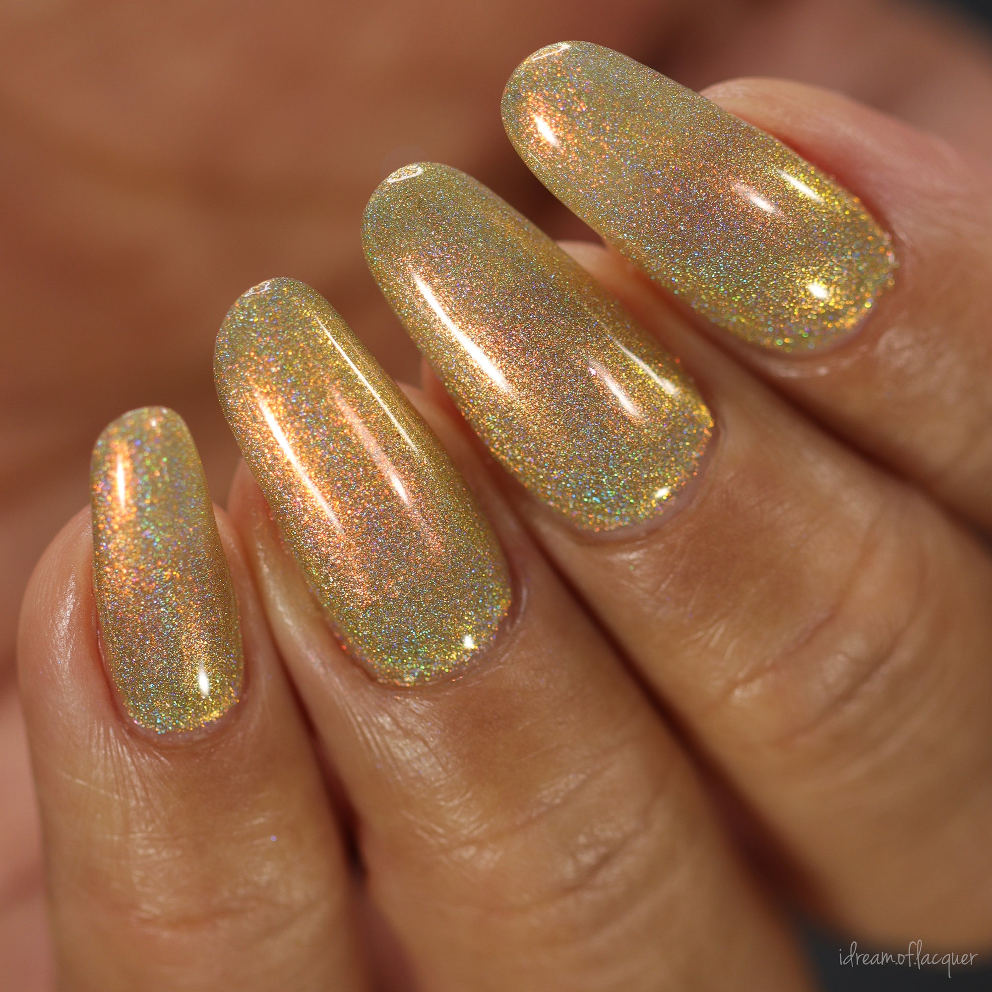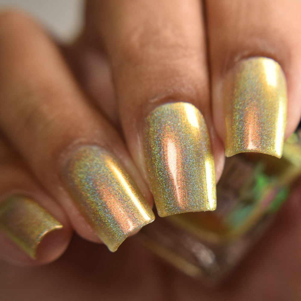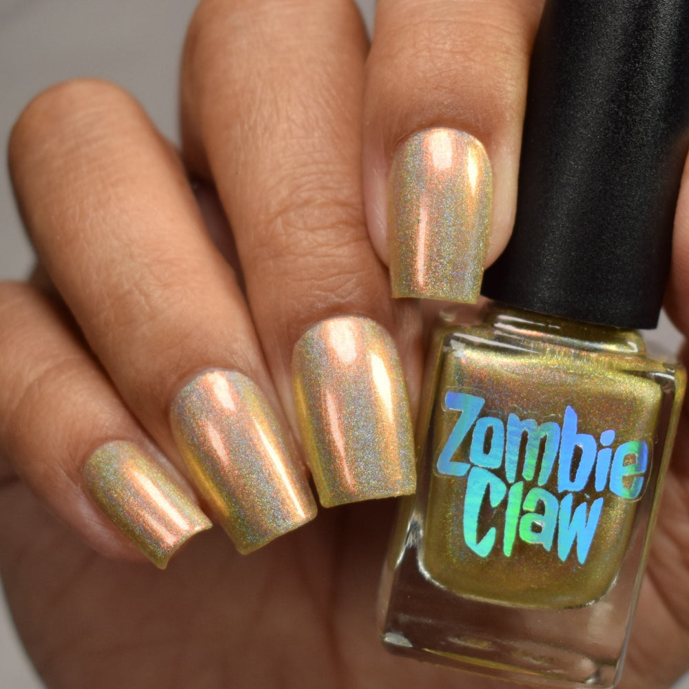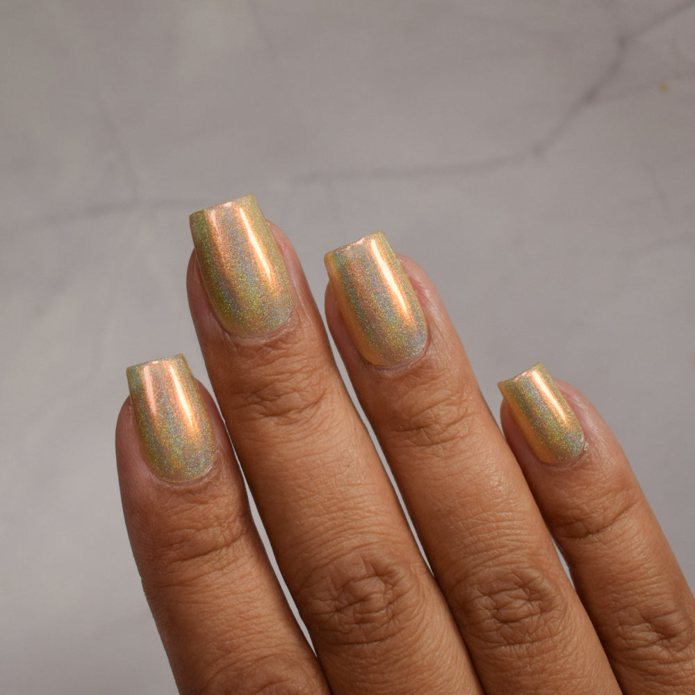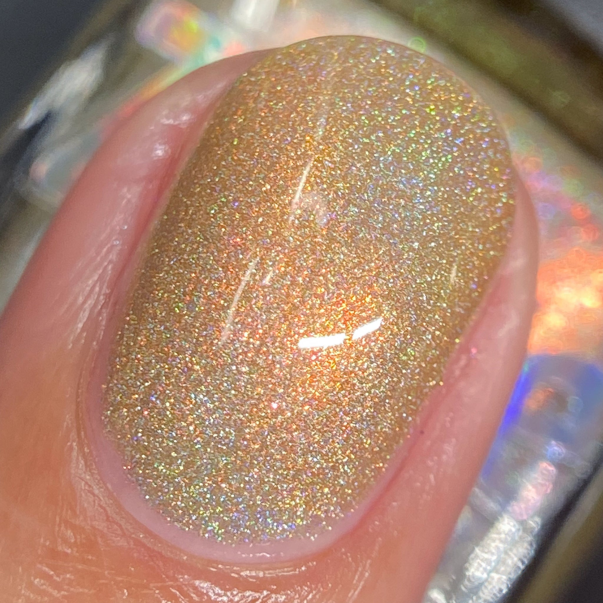 A pale orange base with linear holo and red-copper-gold shimmer.