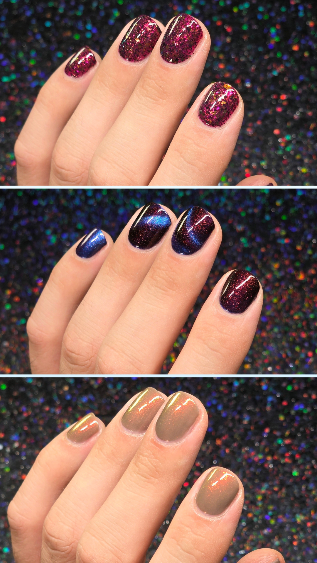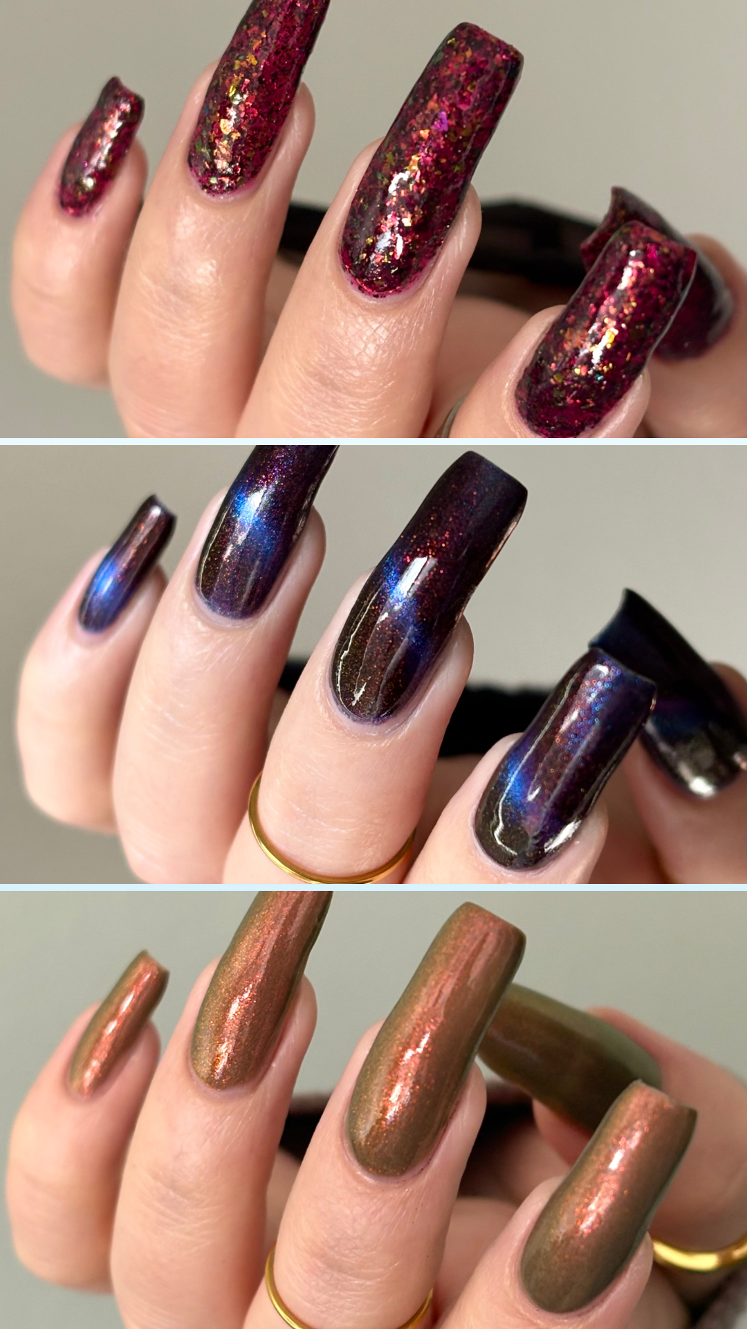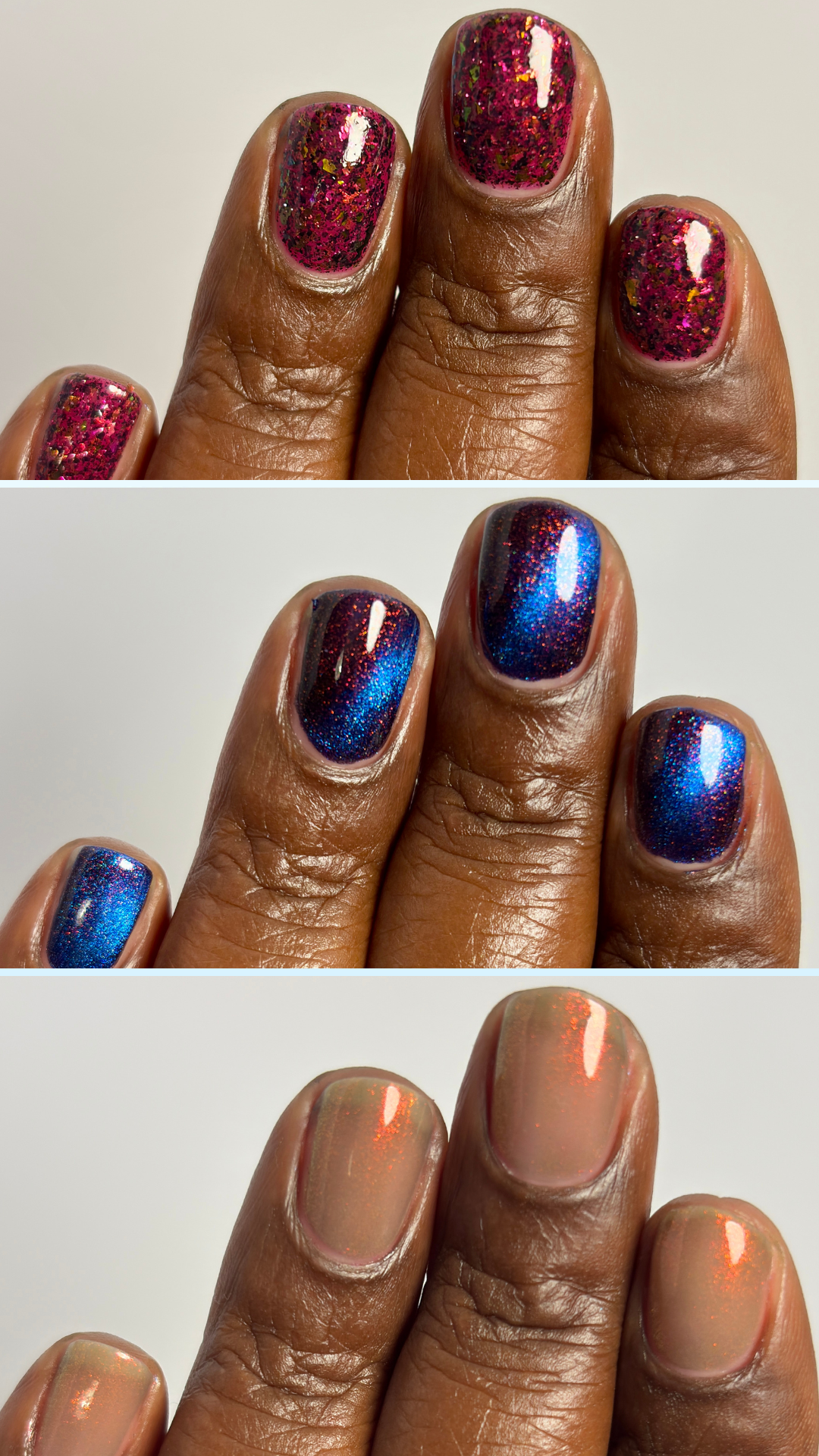 (BCB) Nighstade: Magnetic polish: a deep purple base with a blue/purple multichrome magnetic pull and a red/orange/gold/green shifting shimmer.