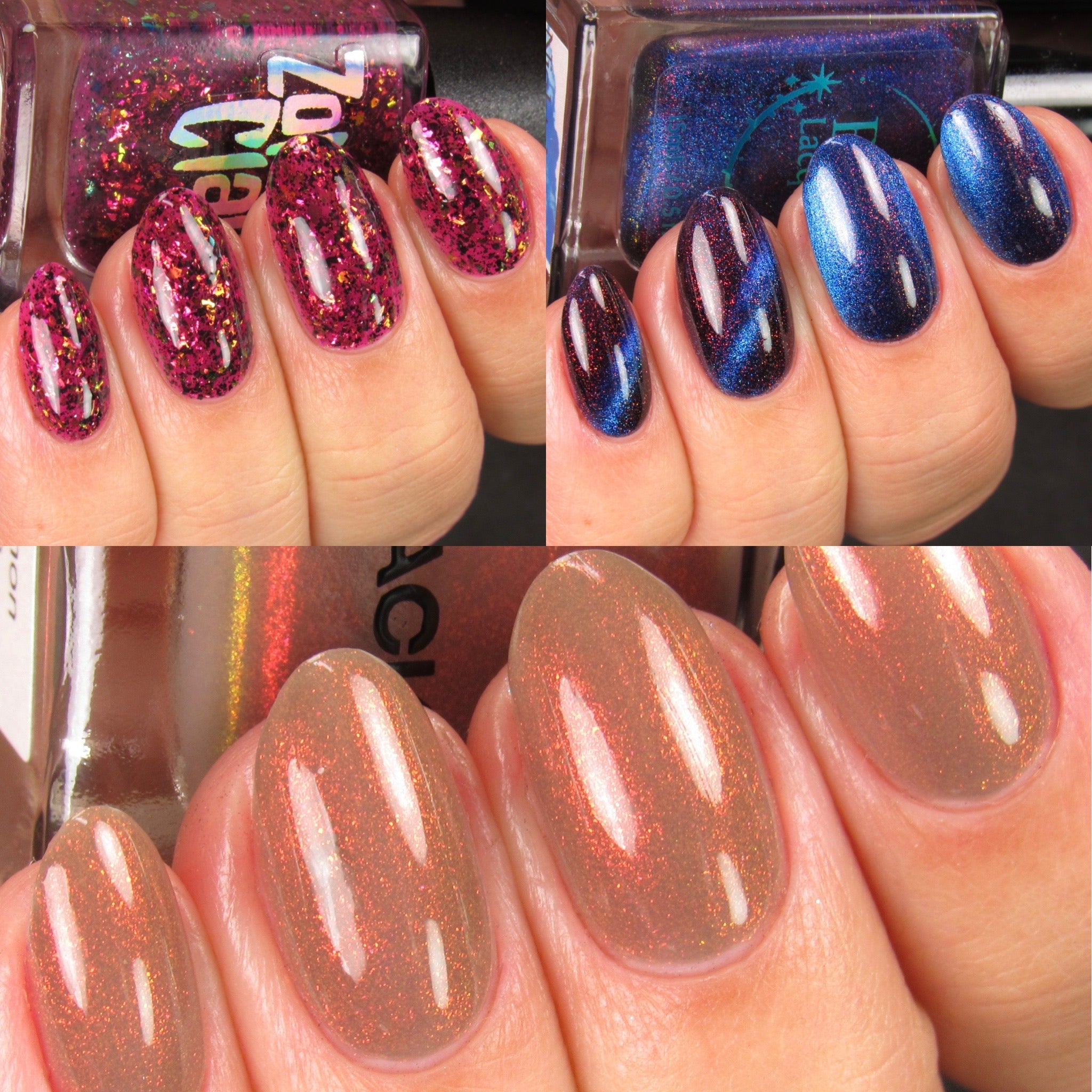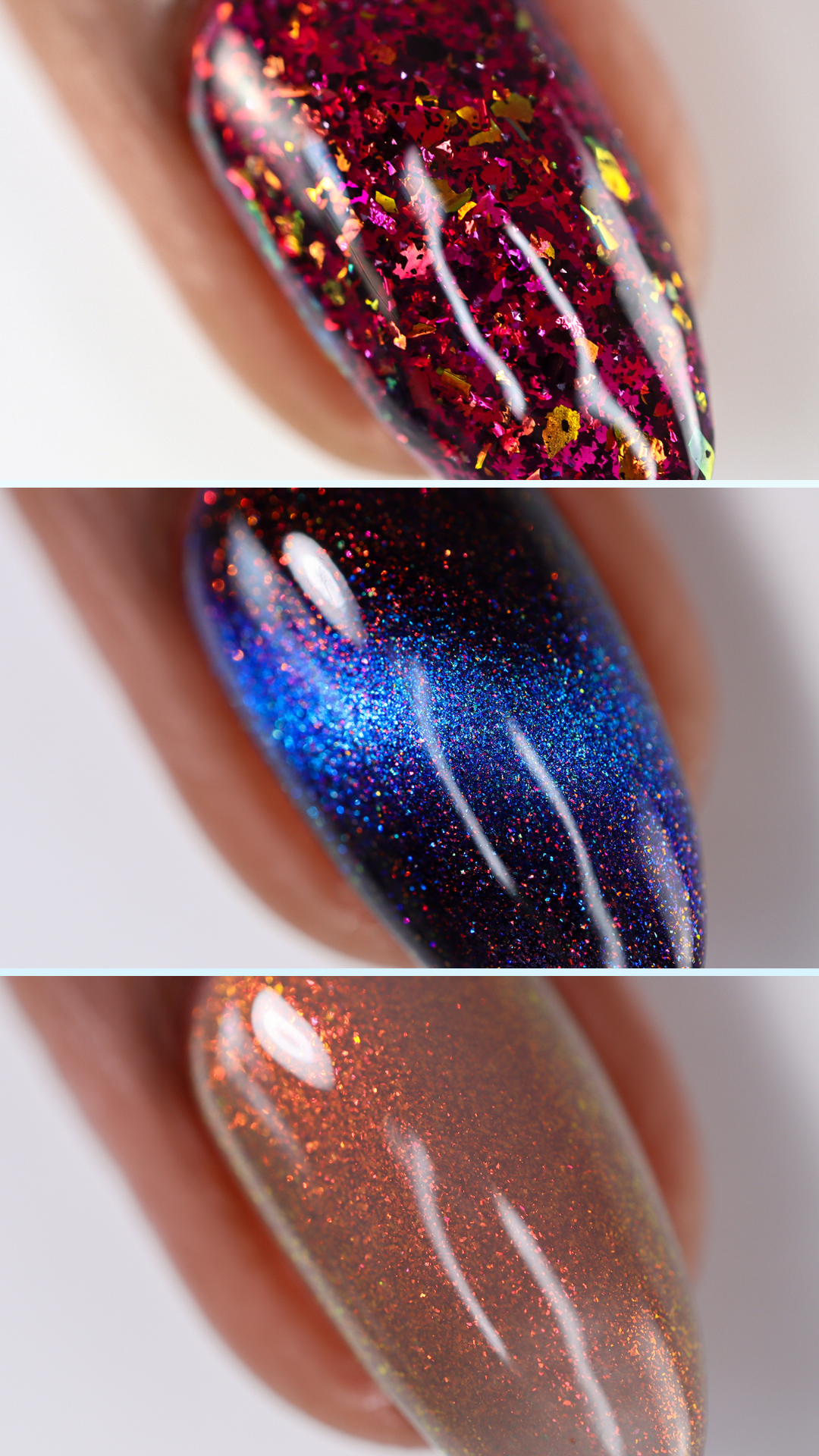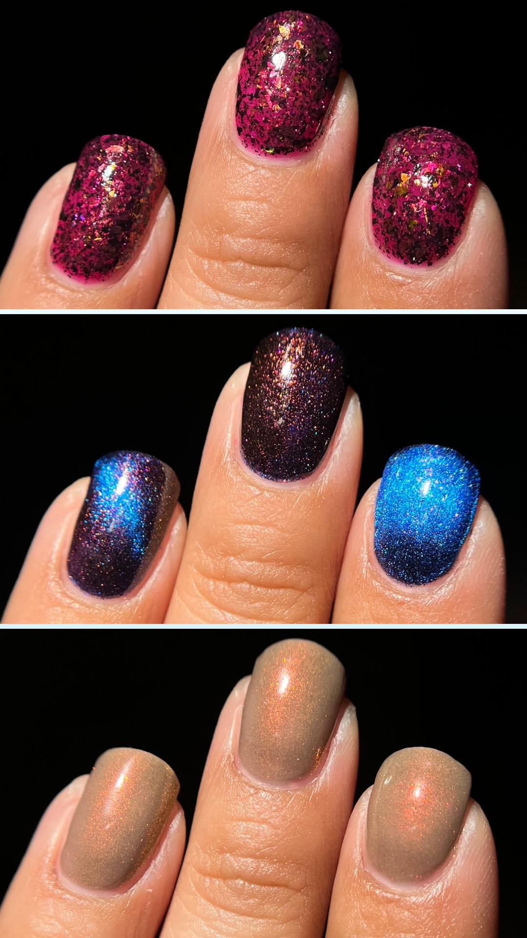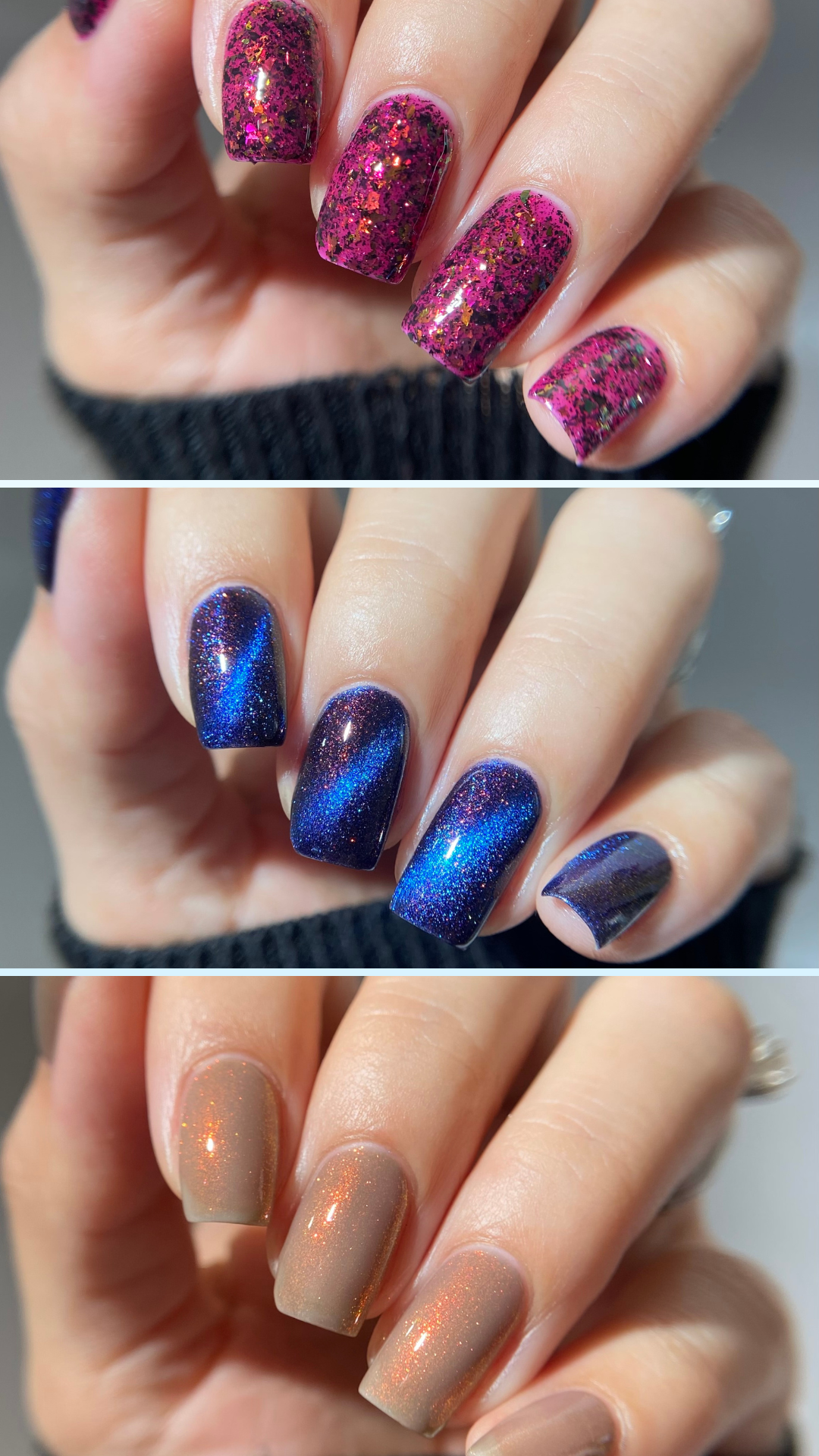 (BCB) Nighstade: Magnetic polish: a deep purple base with a blue/purple multichrome magnetic pull and a red/orange/gold/green shifting shimmer.